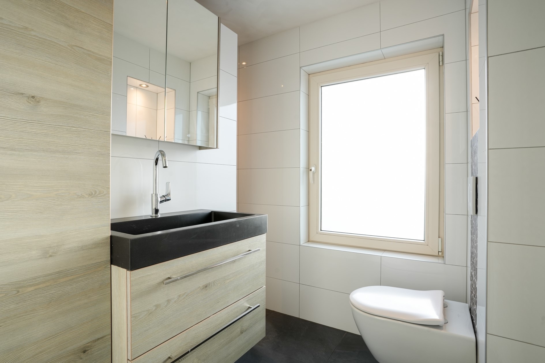 Moderne badkamer (4,6 m²) voorzien van dubbele douche, zwevend toilet en wastafel.
