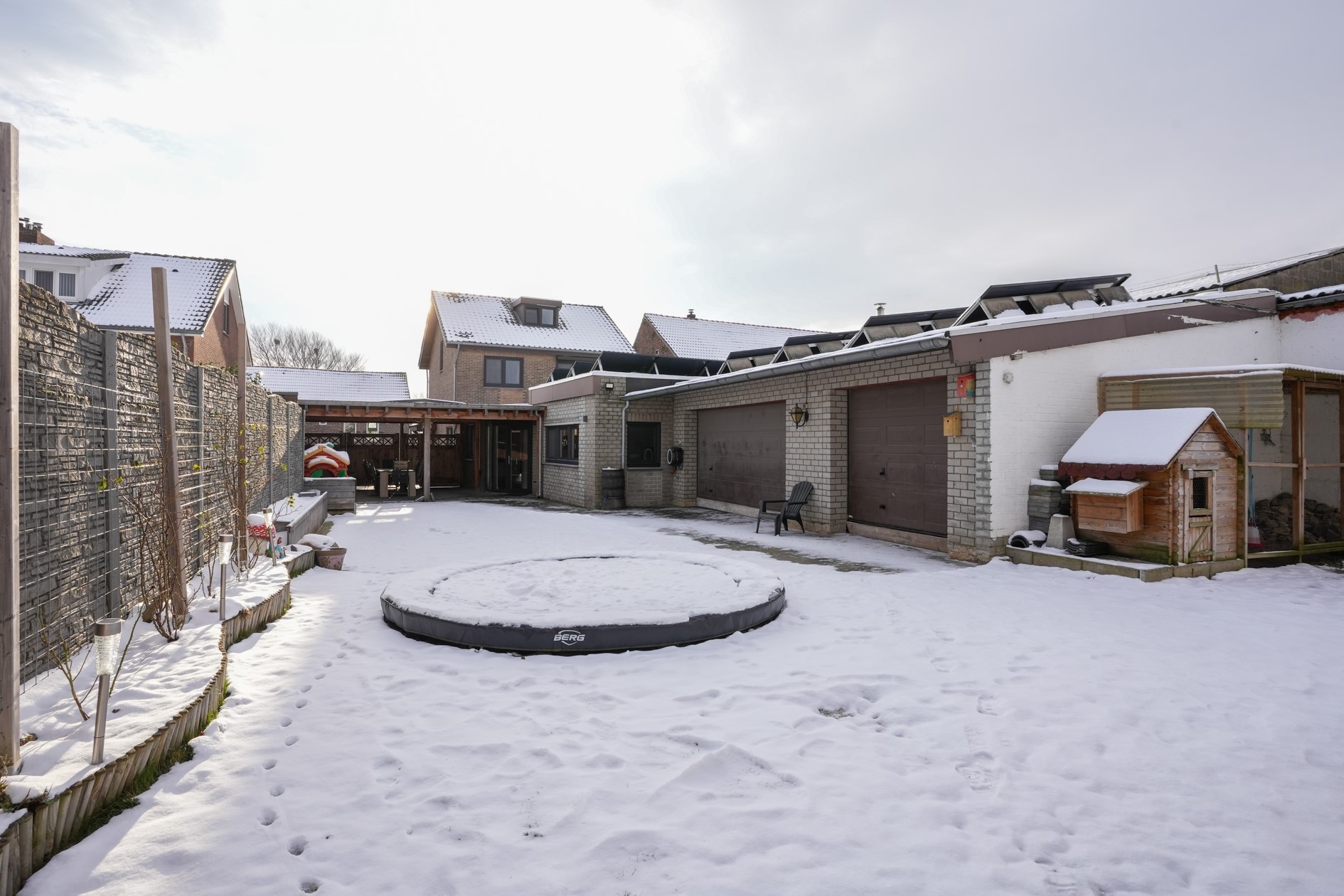 Daarnaast beschikt de tuin over een ruime dubbele garage met elektrische sectionaalpoort (totaal 57 m²).