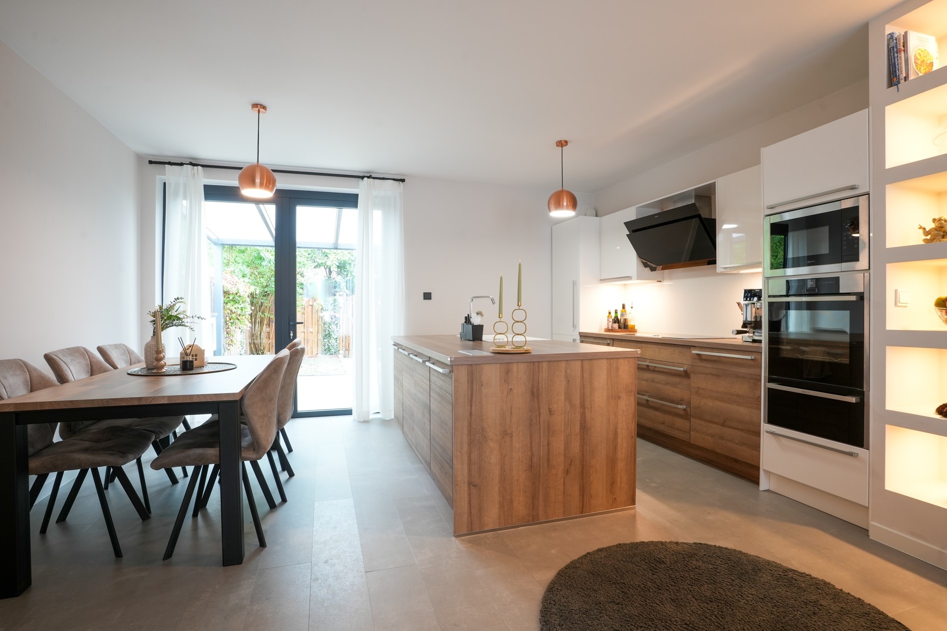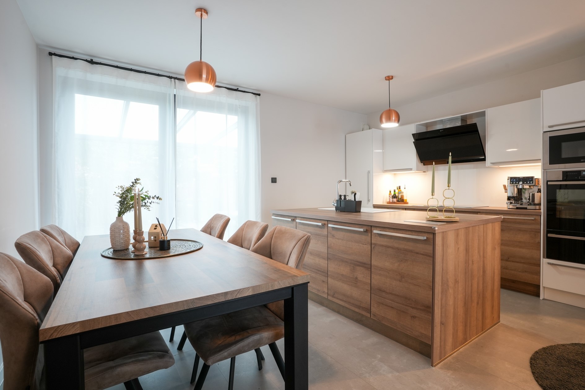 Luxe keuken met werkeiland, voorzien van de volgende apparatuur: inductiekookplaat met afzuigkap, oven, magnetron, koelkast, diepvries en vaatwasser.