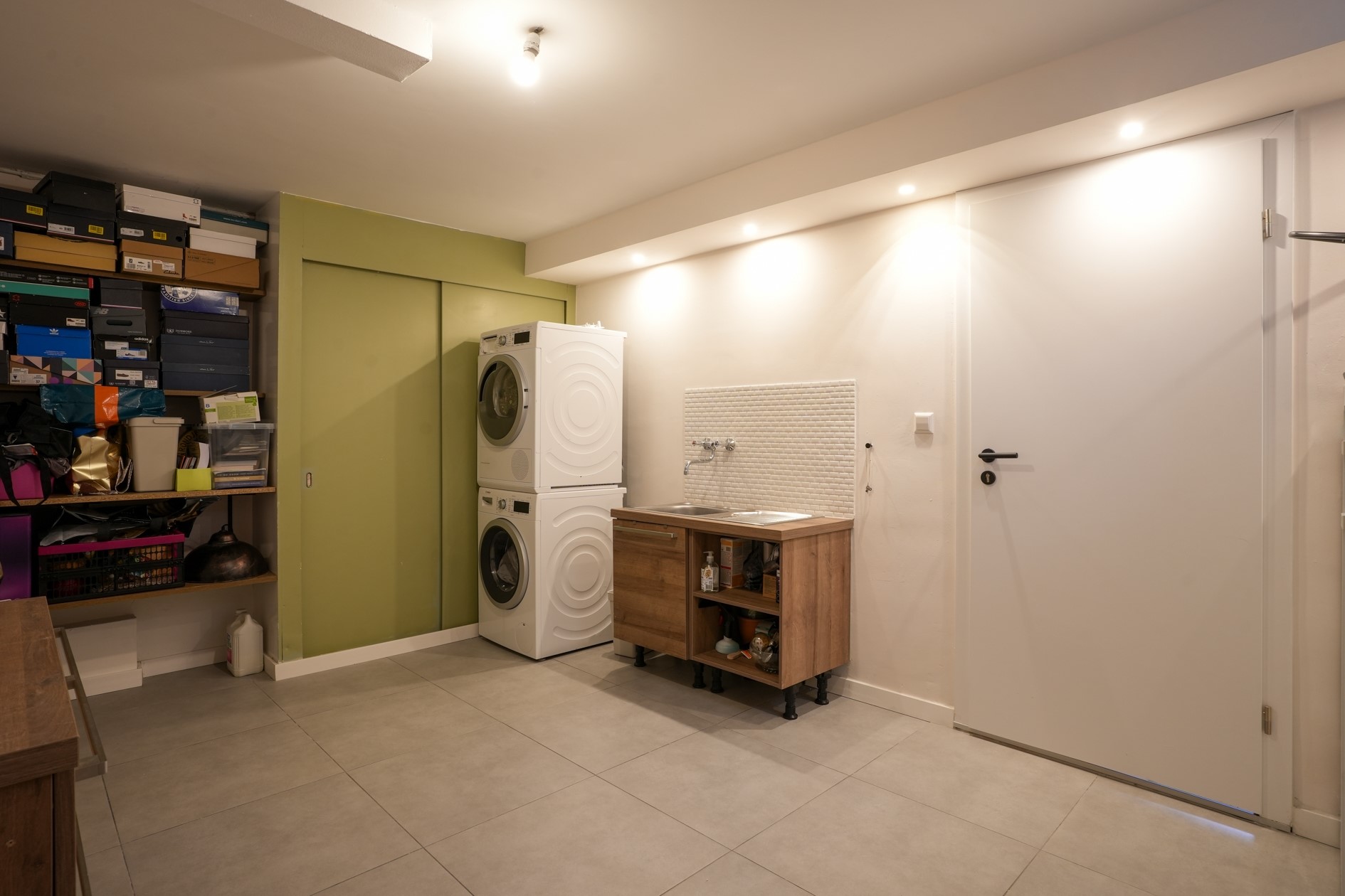 Berging/hobbyruimte voorzien van een betegelde vloer met witgoedaansluitingen (15,7 m²) en CV combiketel (Vaillant, eigendom 2012).