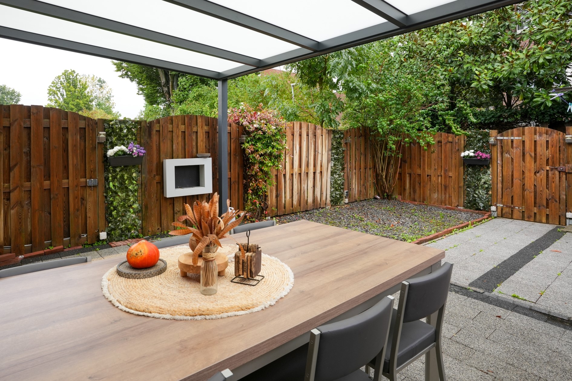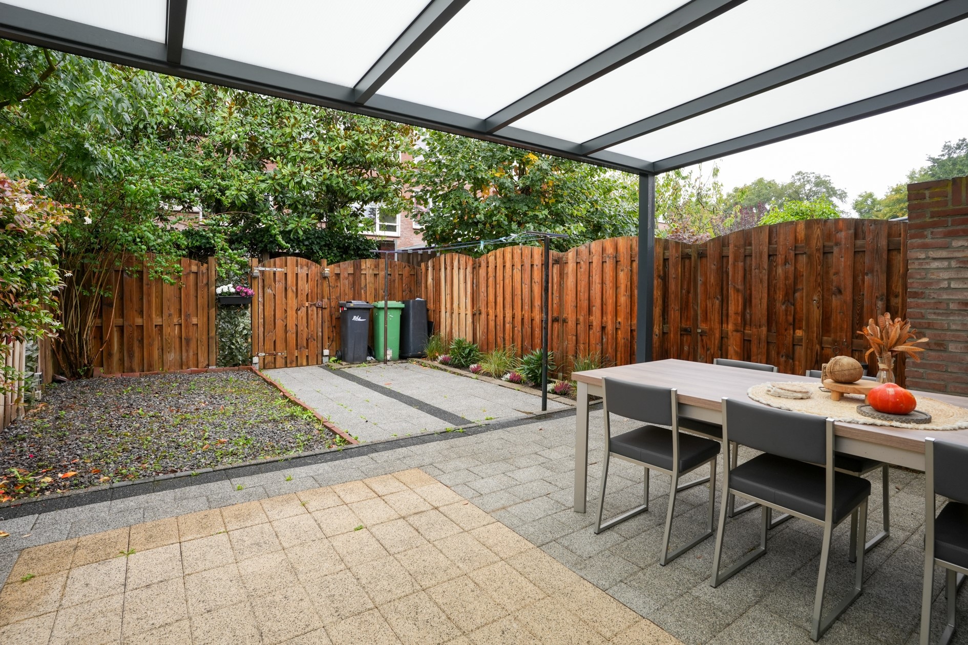 Fraaie achtertuin met overkapping en een achterom.