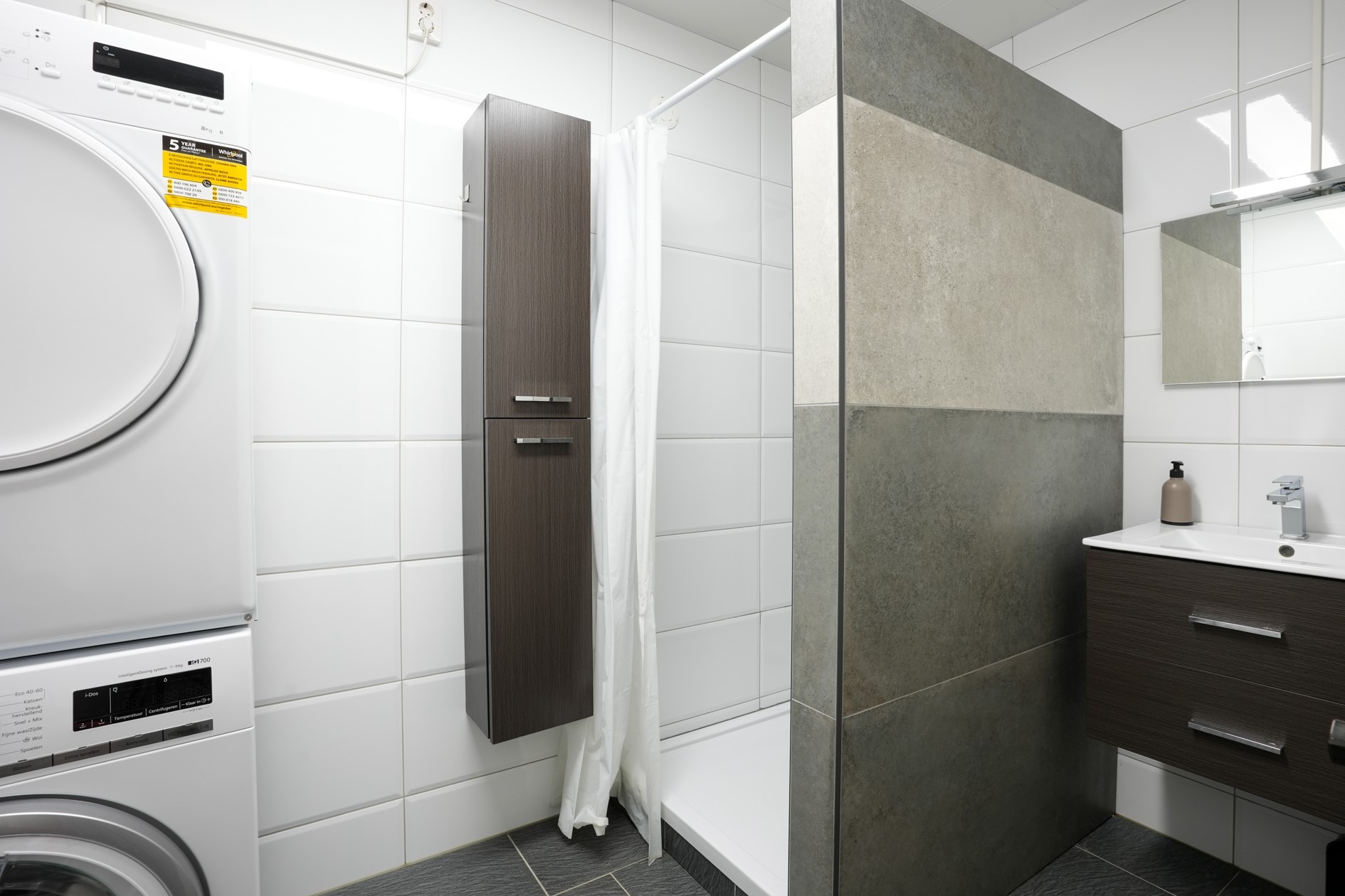 De recent vernieuwde badkamer (5,5 m²) is modern en functioneel ingericht met een douche, wastafel en aansluitingen voor witgoed. Het toilet is separaat.
