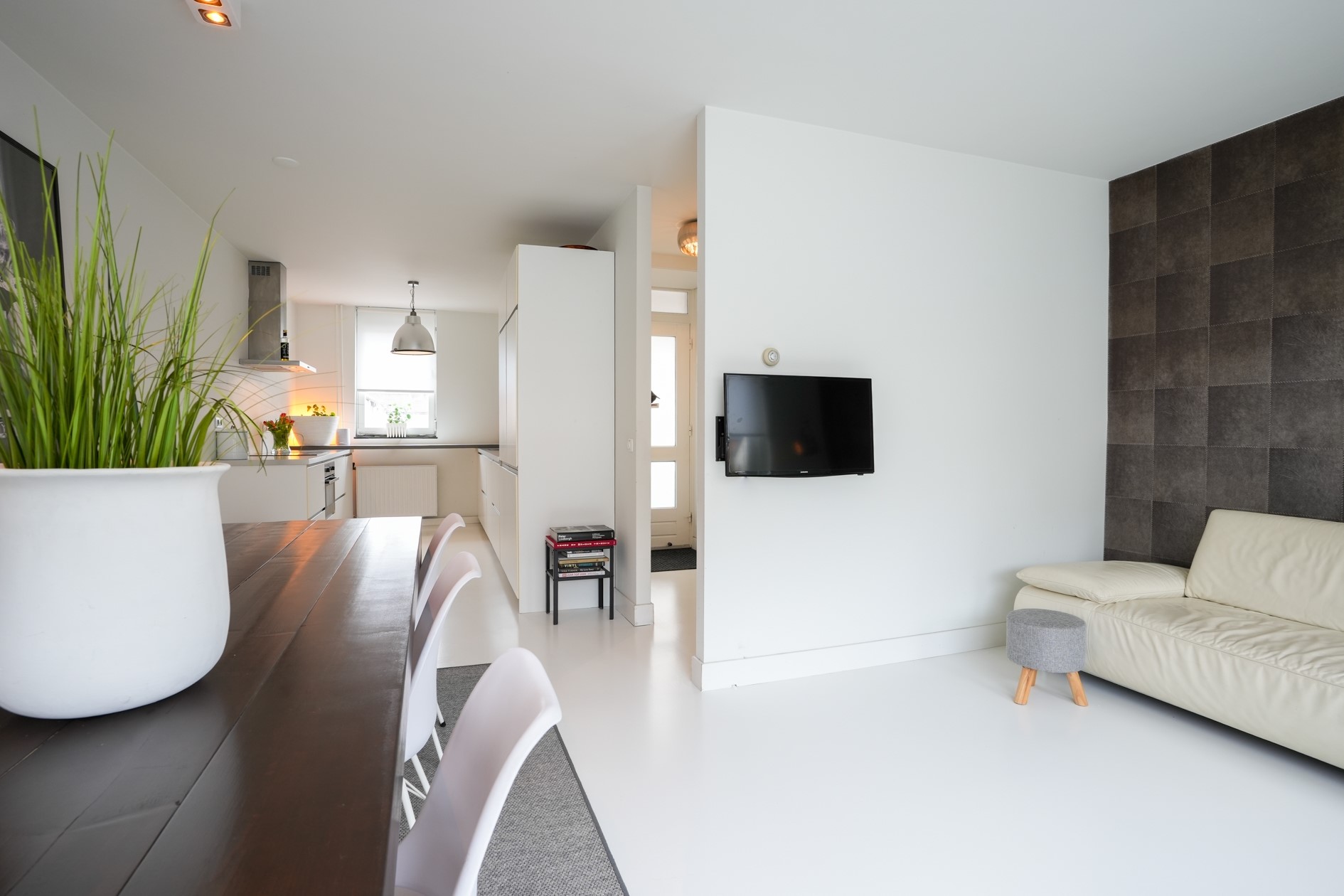 Een lichte woonkamer met een moderne open keuken zorgen voor een prettige woonsfeer.
