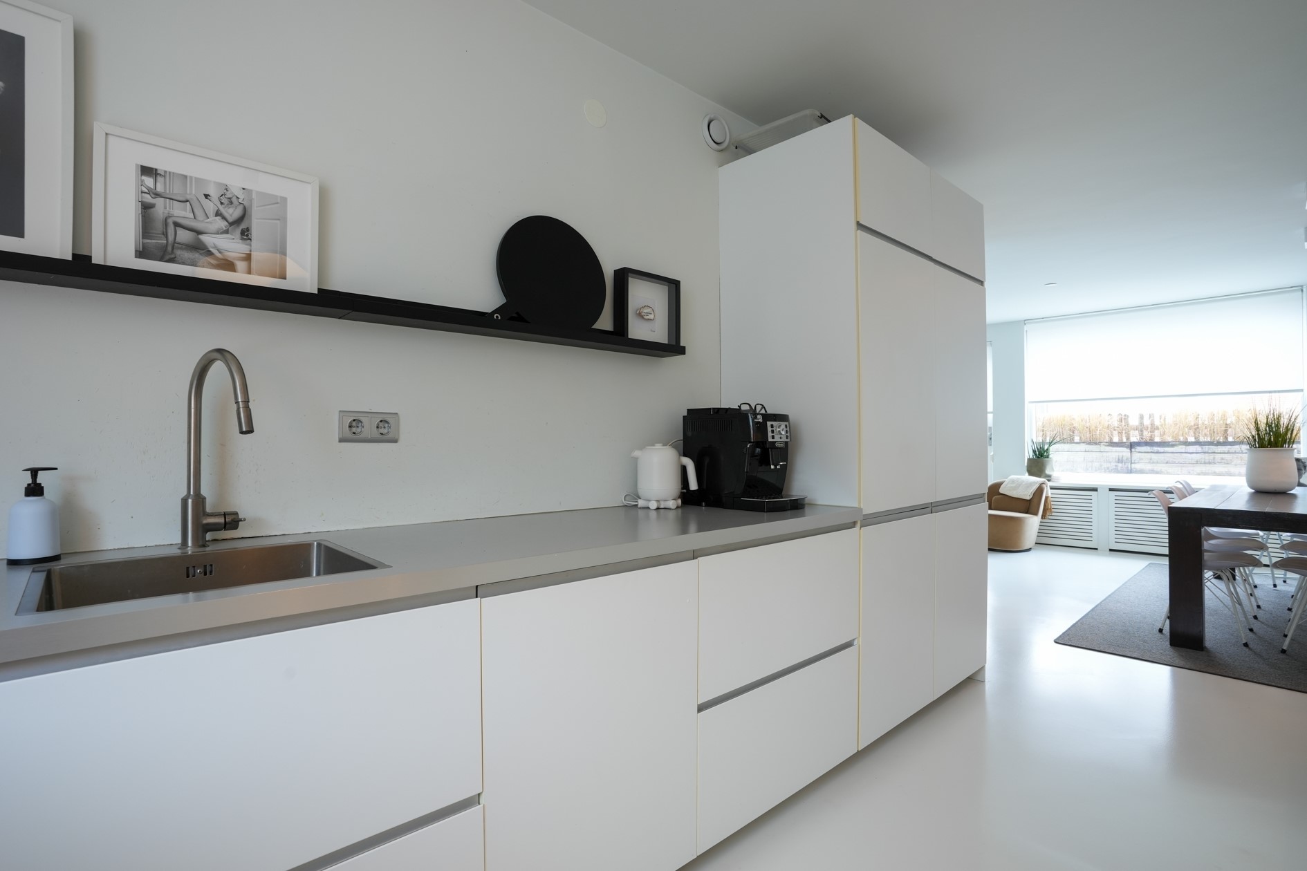 De lichte, open woonkamer geeft direct toegang tot het balkon en zorgt voor een prettige en open leefruimte. De moderne, complete keuken is uitgevoerd met een inductiekookplaat, afzuigkap, vaatwasser, koelkast en vrieskast. Daarnaast beschikt de keuken over ruime ladeblokken, wat zorgt voor veel praktische bergruimte.