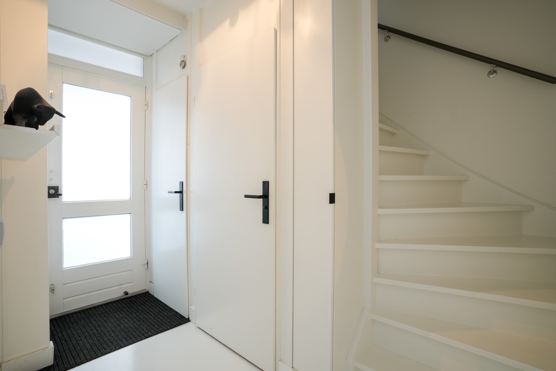 Via een buitentrap is de woning bereikbaar. De entree biedt toegang tot de woonkamer en beschikt over een modern, zwevend toilet en een trap naar de tweede verdieping.