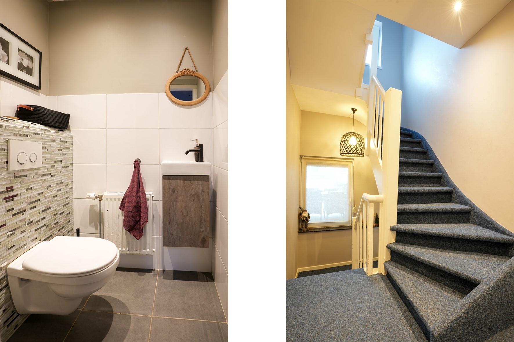 Overloop met moderne toiletruimte. Trap naar de tweede verdieping.