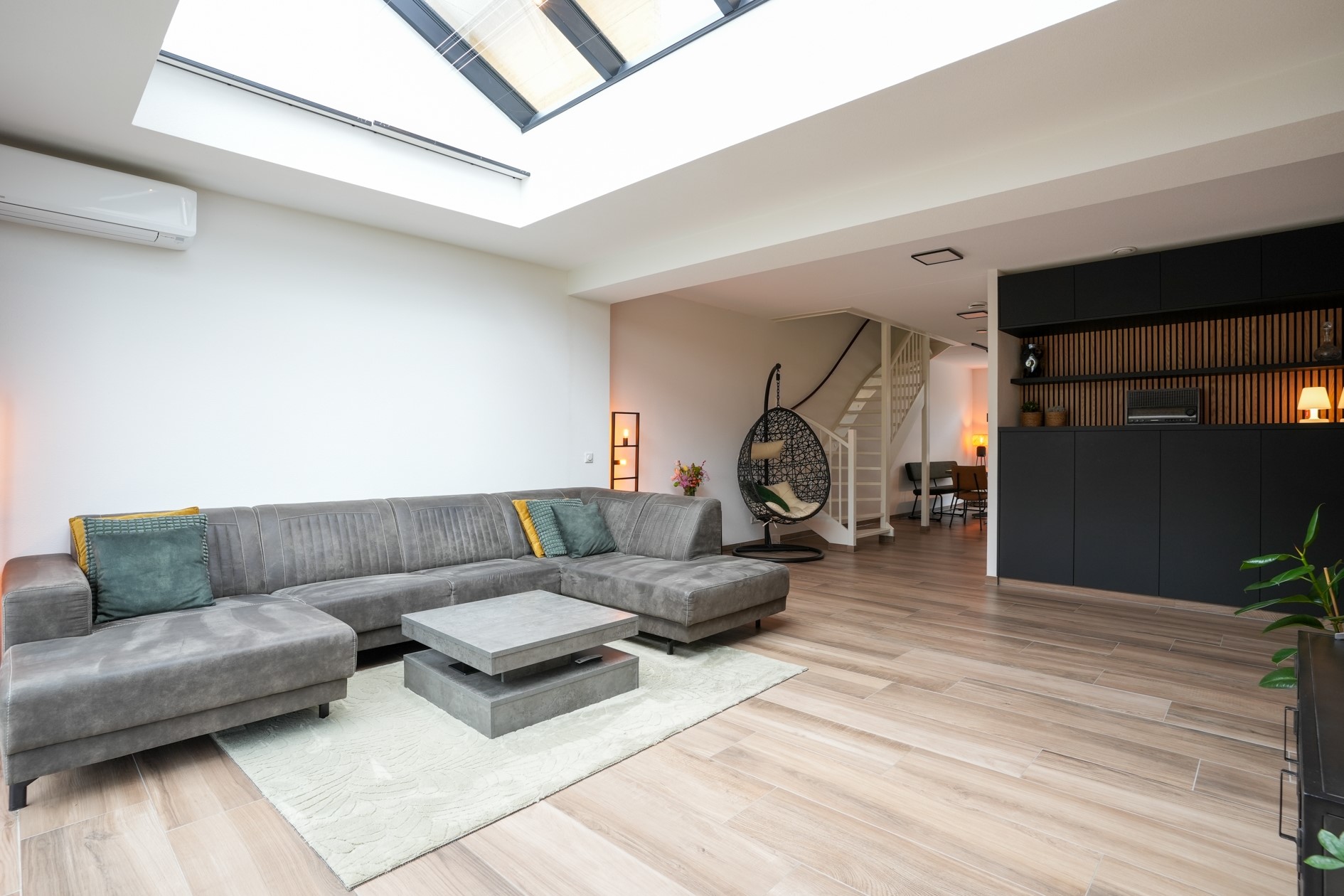 De royale woon- en eetkamer heeft een oppervlakte van maar liefst 52 m² en is voorzien van een houtlook tegelvloer. Vanuit de woonkamer leidt een vaste trap naar de eerste verdieping. De begane grond is uitgerust met vloerverwarming en een airco-unit, waarmee zowel gekoeld als verwarmd kan worden.