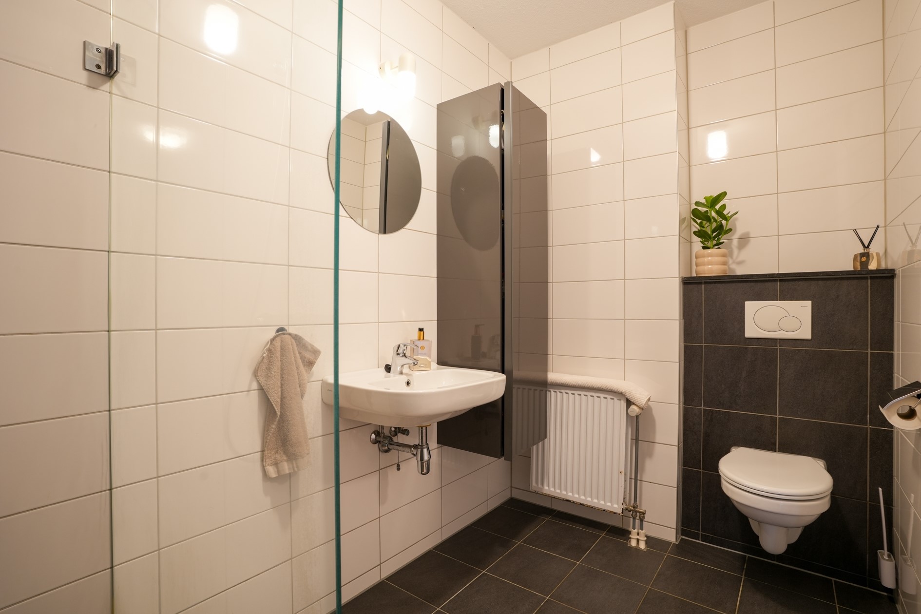 Nette toiletruimte voorzien van hangend toilet en fonteintje.