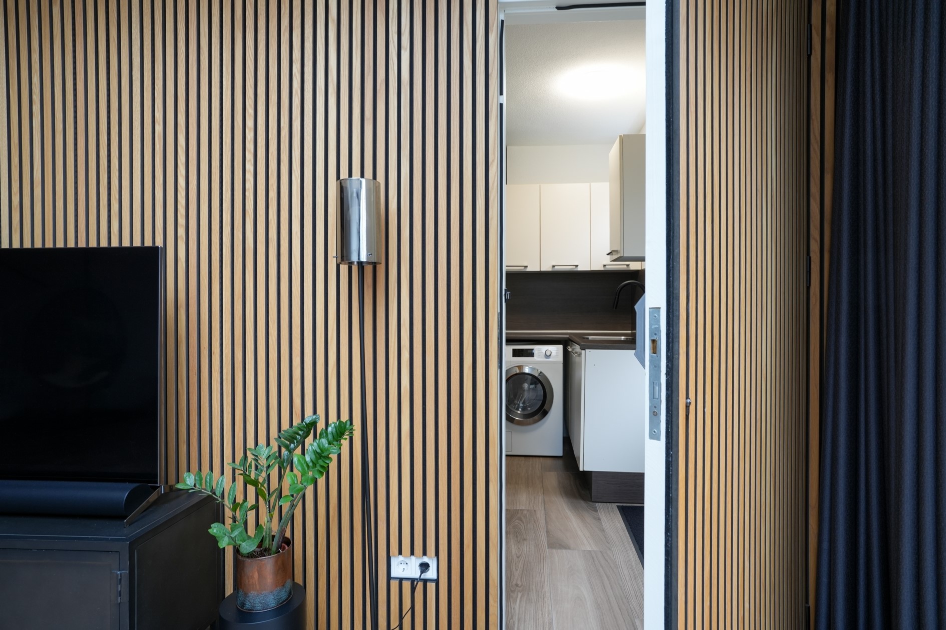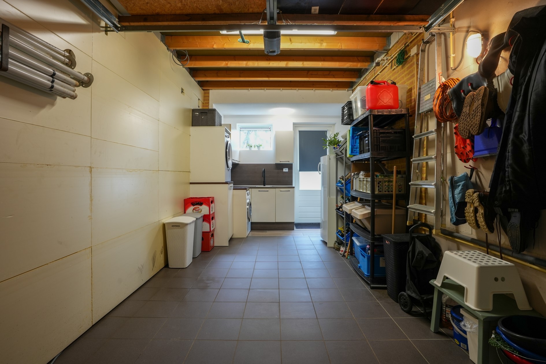 De garage is deels ingericht als wasruimte/bijkeuken en voorzien van een elektrische sectionaalpoort.