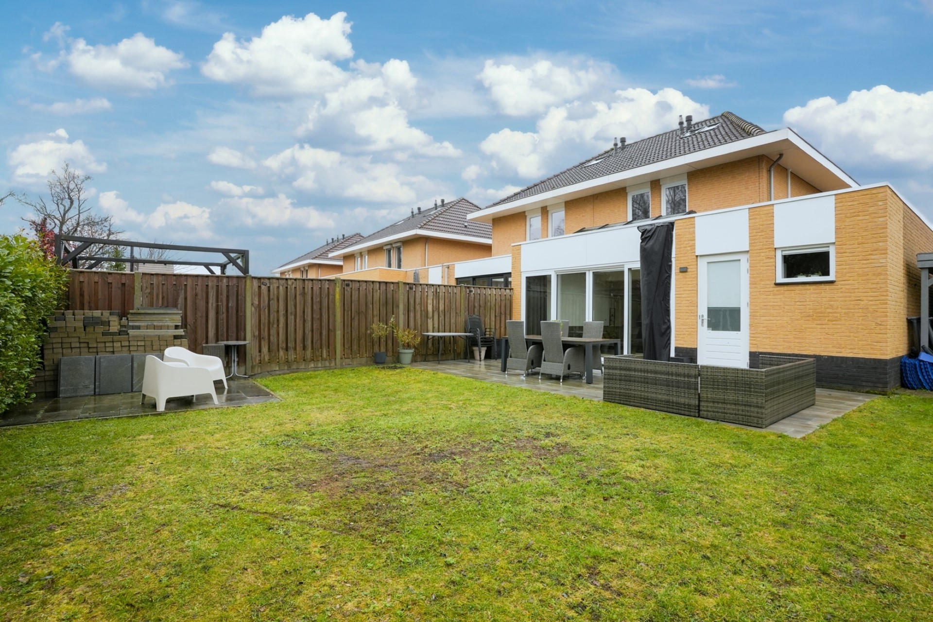 Via een schuifpui is de tuin bereikbaar. Daarnaast is er toegang tot de inpandige garage (19 m²).
