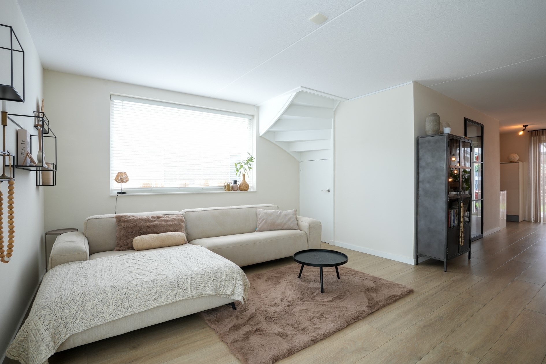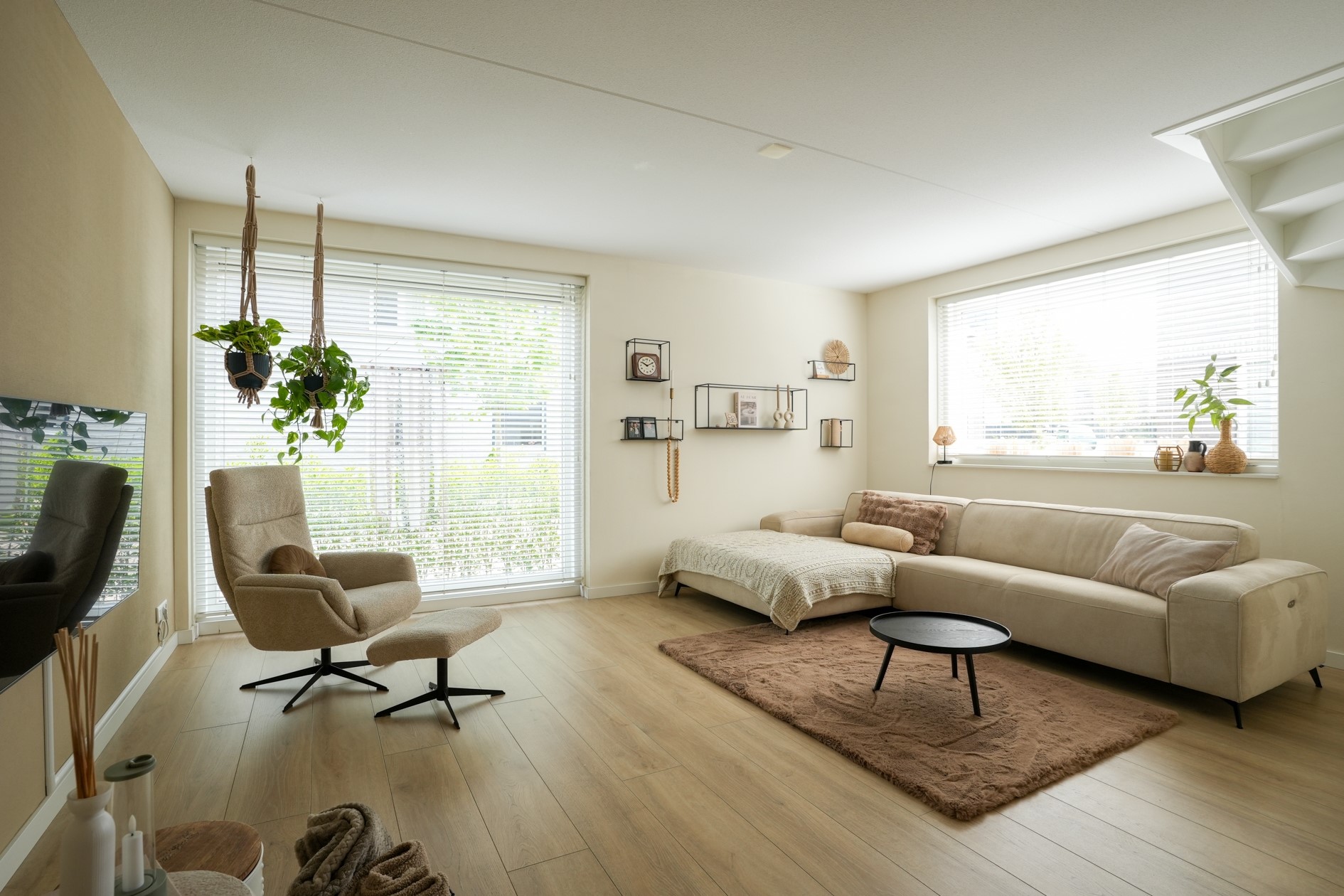 Via de entree met meterkast en praktische trapberging kom je in de lichte en royale leefruimte. Hier vind je een sfeervolle woonkamer met halfopen keuken, samen goed voor ruim 45 m² woonplezier. De achtertuin is middels een schuifpui bereikbaar.