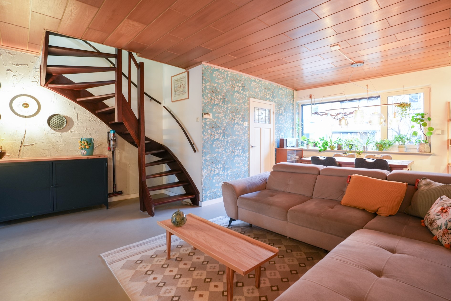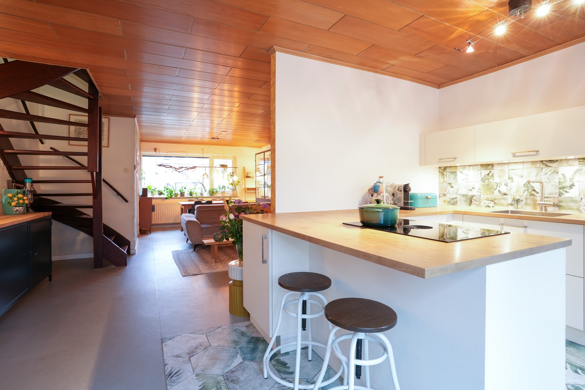 De woonkamer met open keuken heeft een totale oppervlakte van ruim 40 m² en voorzien van een lichte marmoleum vloer. Open trap naar de eerste verdieping.