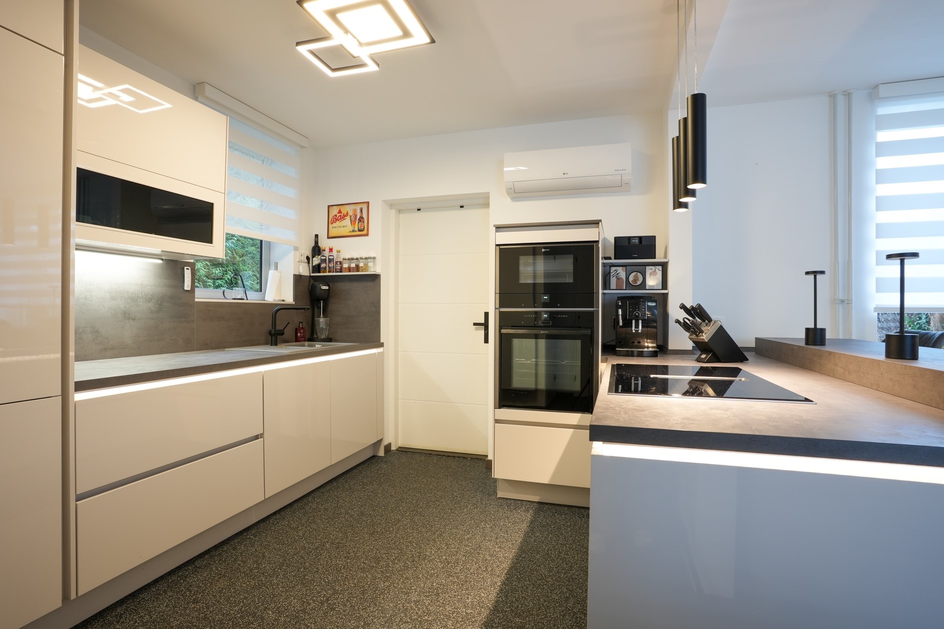 De moderne leefkeuken (10 m²) is uitgerust met hoogwaardige inbouwapparatuur, waaronder een vaatwasser, koelkast, vriezer, oven, magnetron en een inductiekookplaat met geïntegreerde afzuiging.