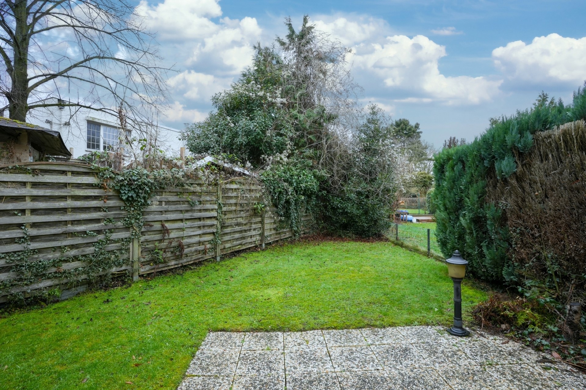 Achtertuin gelegen op het noordwesten met gazon en terras.