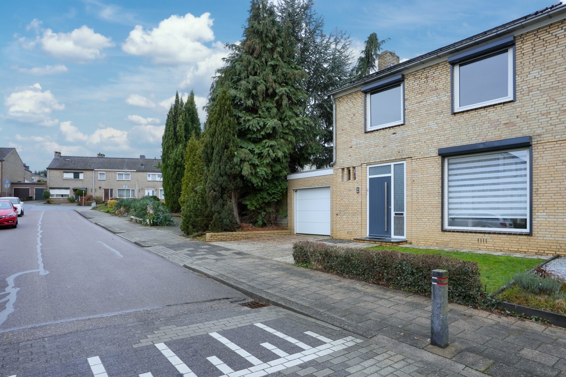 Garage (12 m²) met elektrische sectionaalpoort. Voor de garage bevindt zich een oprit voor twee personenauto's.