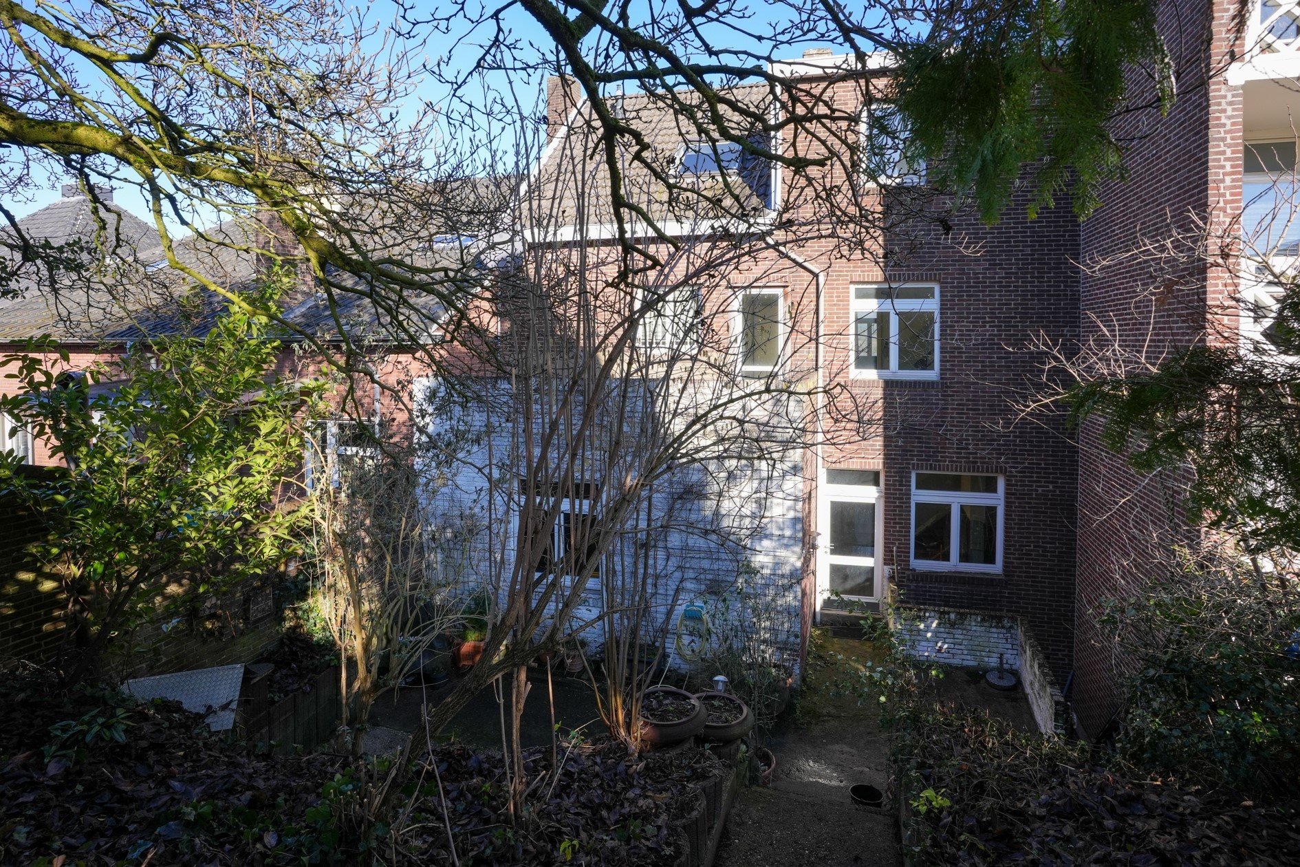 Direct aan de woning bevindt zich een stenen terras met buitenkachel, een fijne plek om tot in de avonduren te genieten. Via een trap is het hoger gelegen deel van de tuin bereikbaar, ingericht met een gazon en een schuurtje.