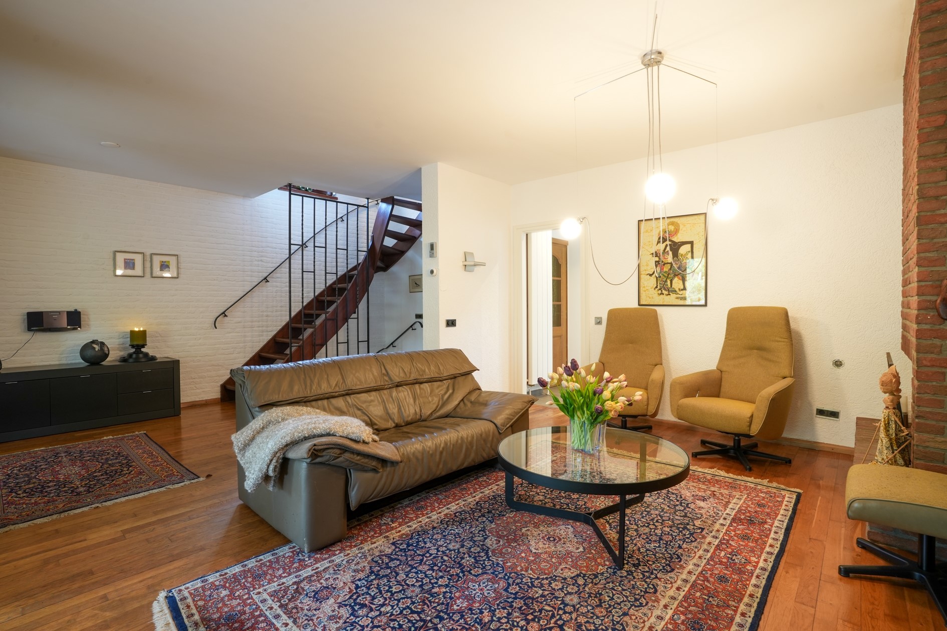 Sfeervolle woonkamer (28 m²) met houthaard en trap naar eerste verdieping.