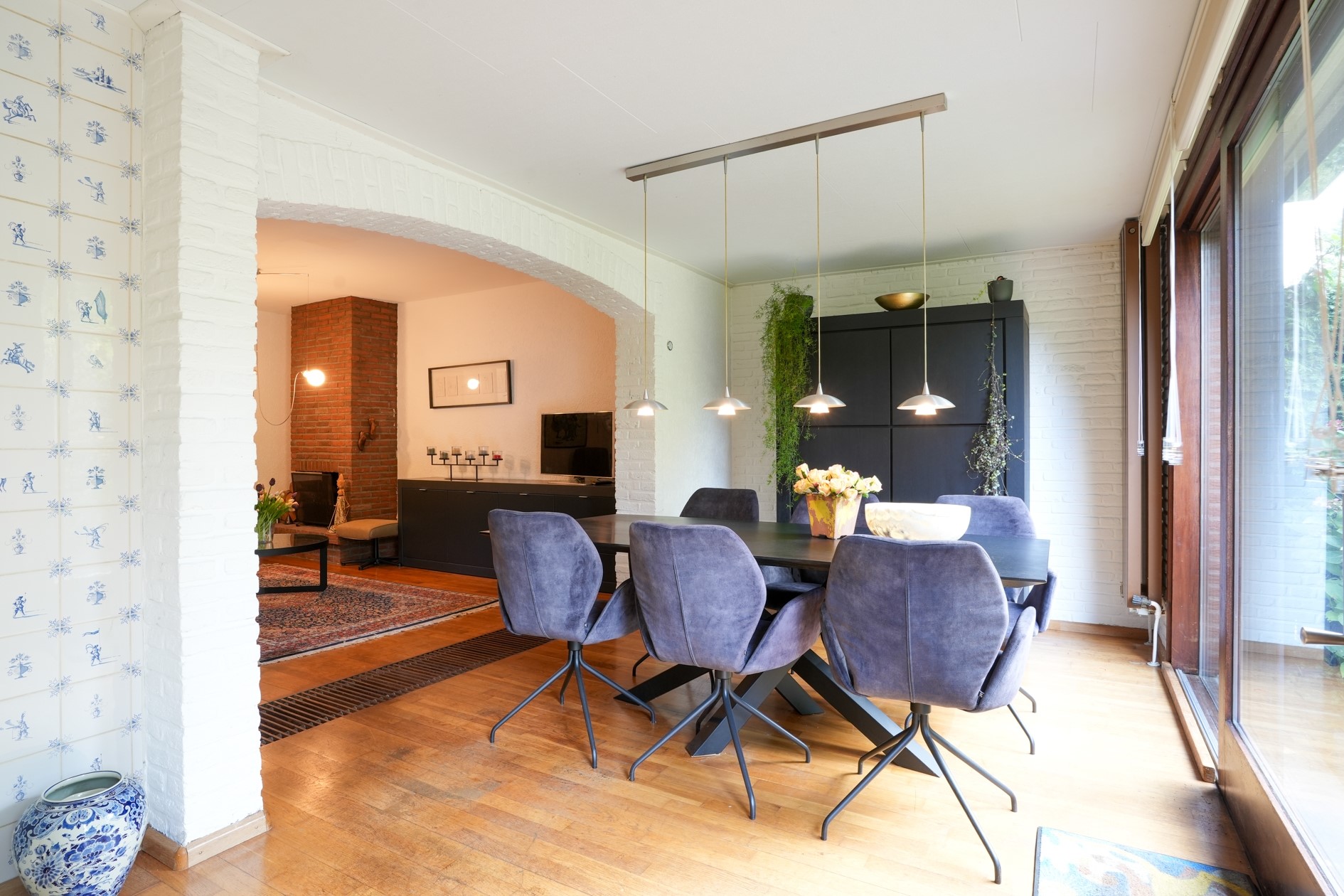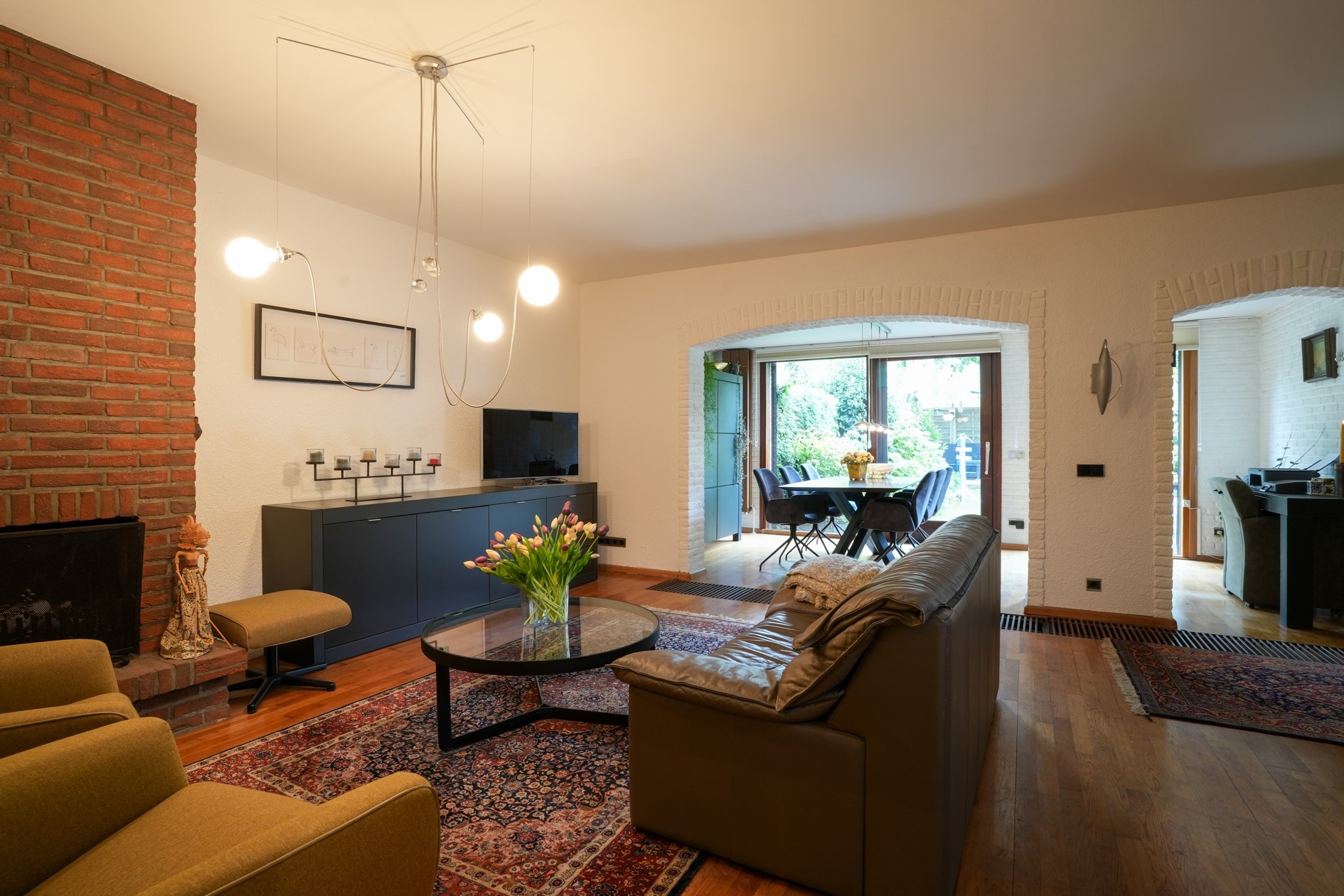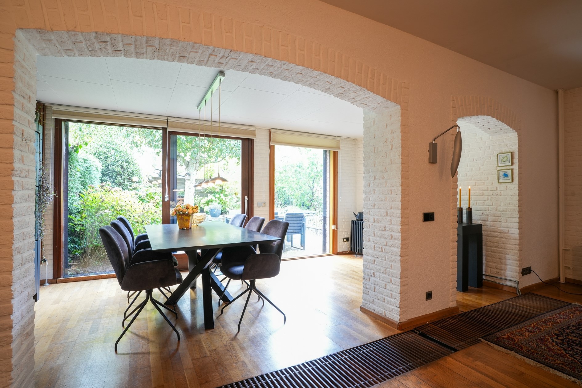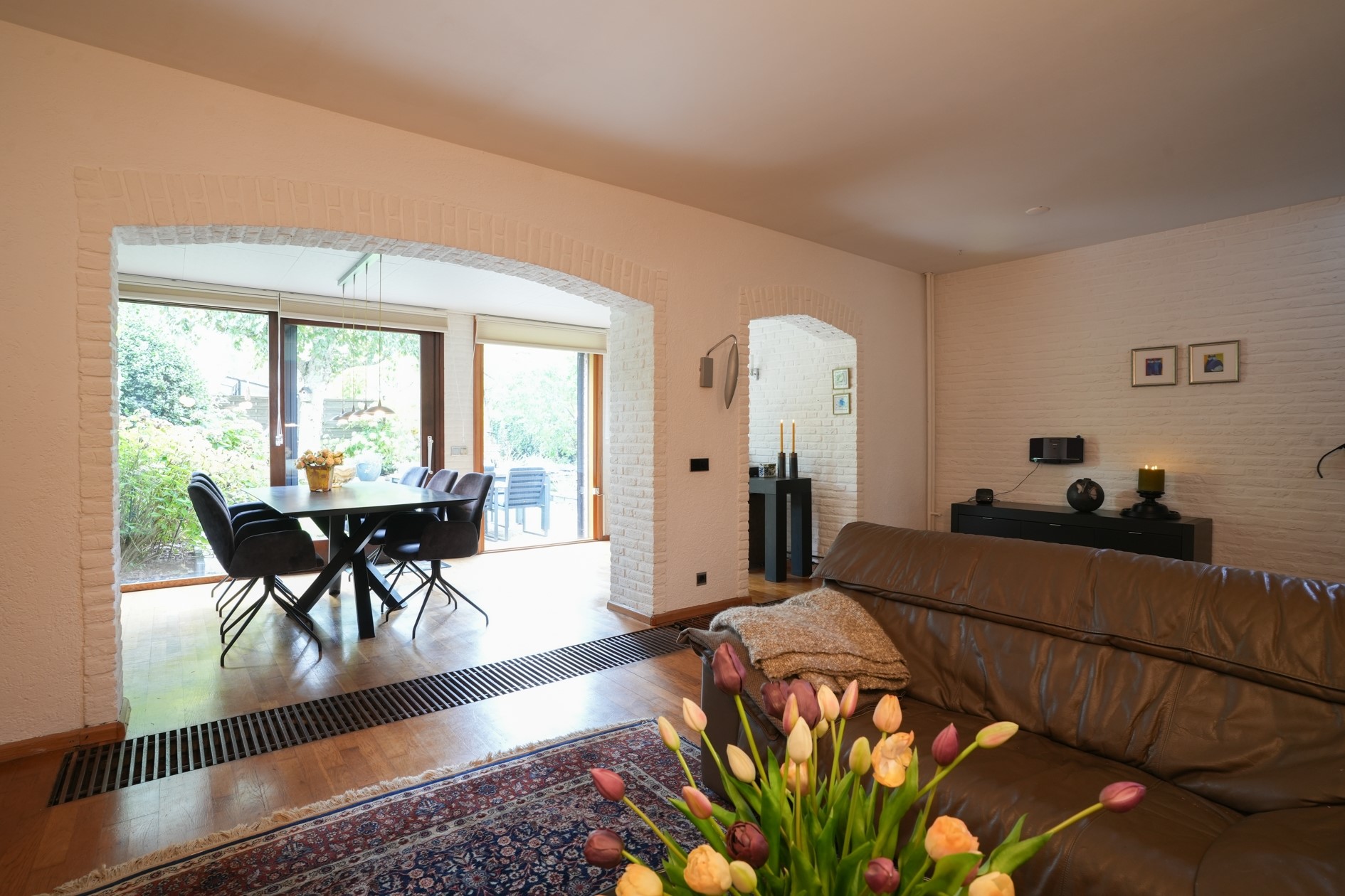 Lichte eetkamer (16 m²) met schuifpui naar de fraaie achtertuin.
