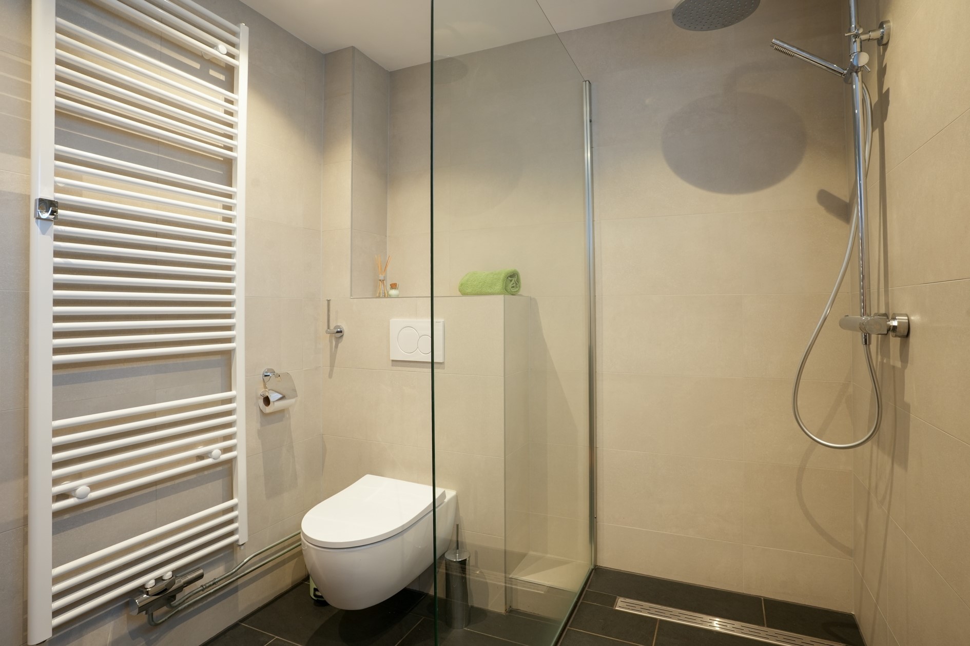 Moderne badkamer van 5,2 m² (2023) met toilet, wastafel en inloopdouche.