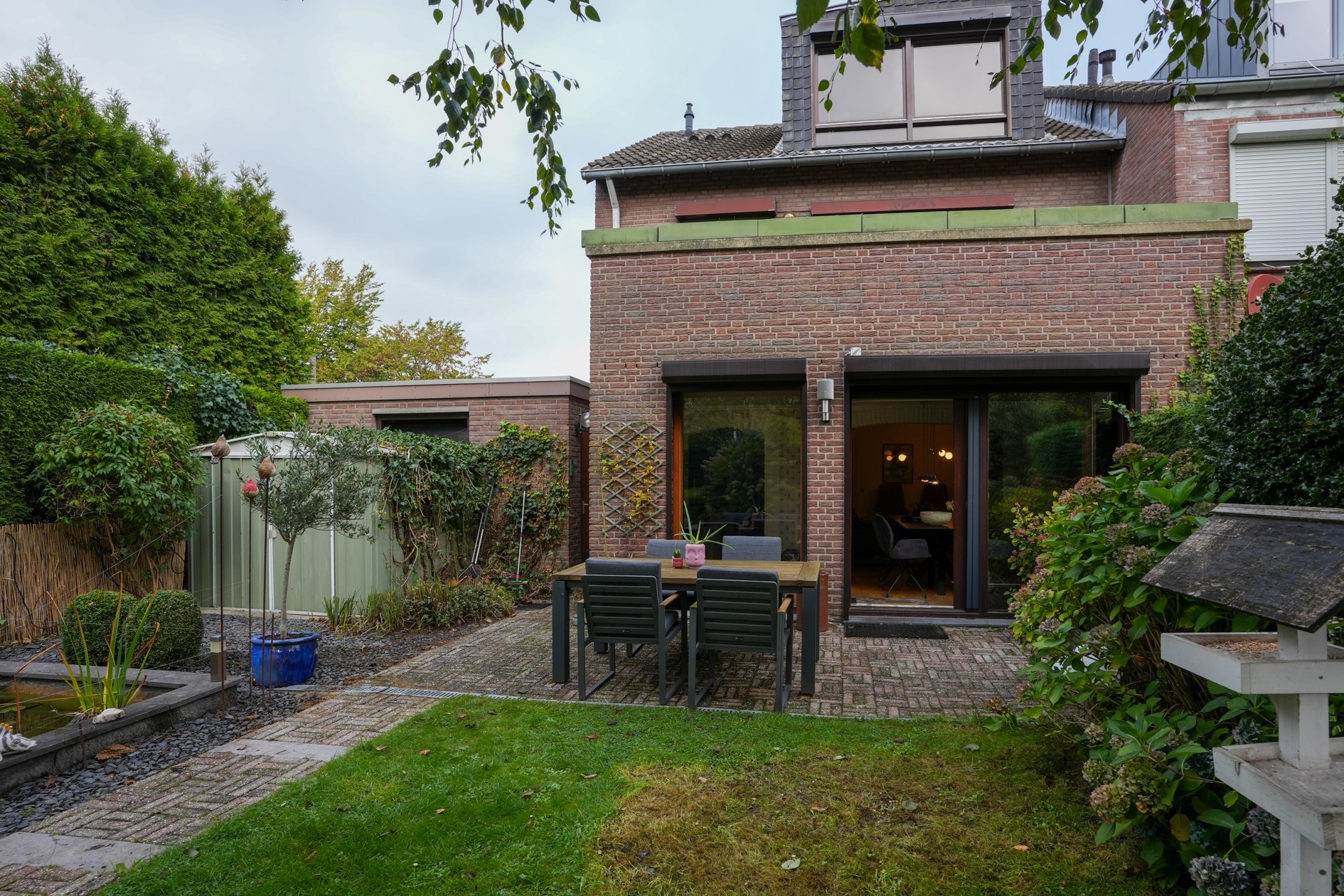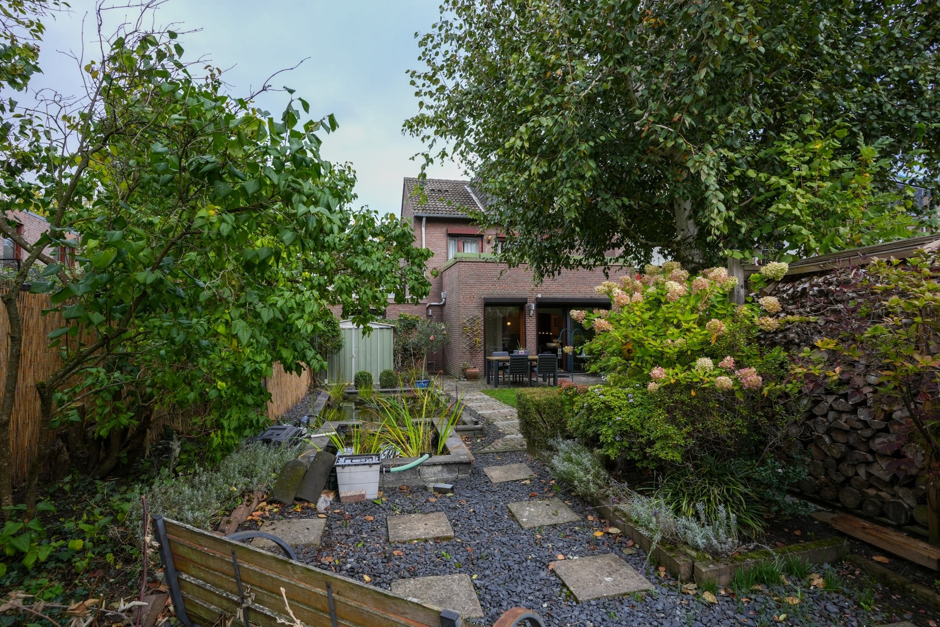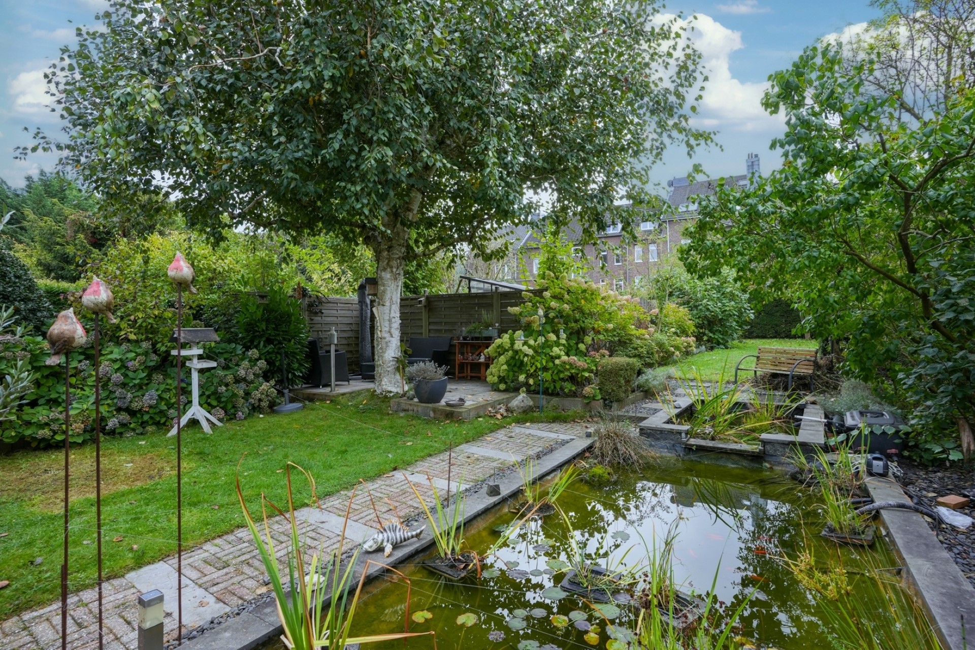 Fraaie, zonnige achtertuin gelegen op het Zuiden. De tuin is een oase van groen, prachtig aangelegd met een terras, gazon, diverse beplanting en een vijverpartij.
