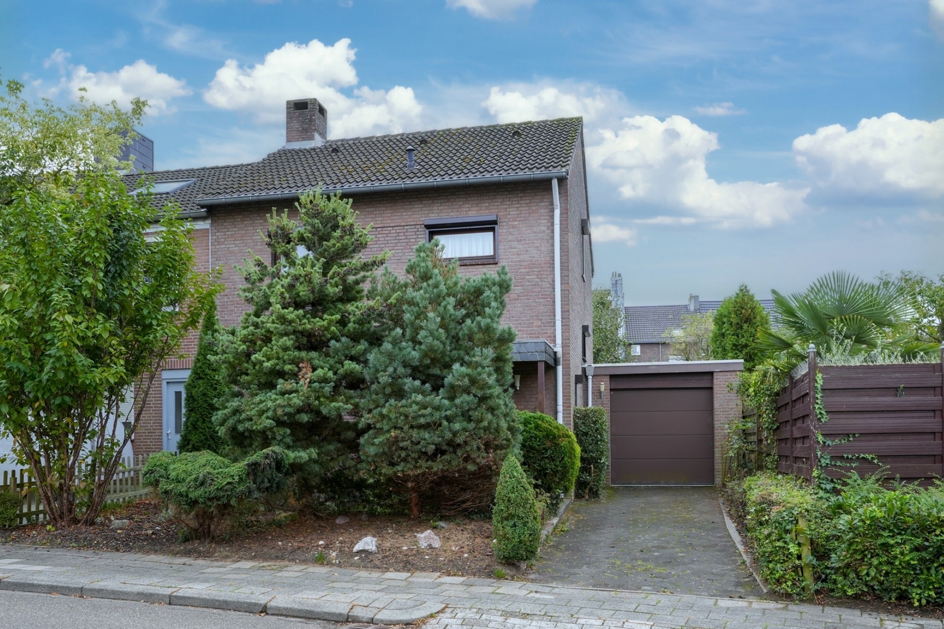 Verzorgd aangelegde voortuin. Oprit met plek voor twee personenauto's naast het huis.
