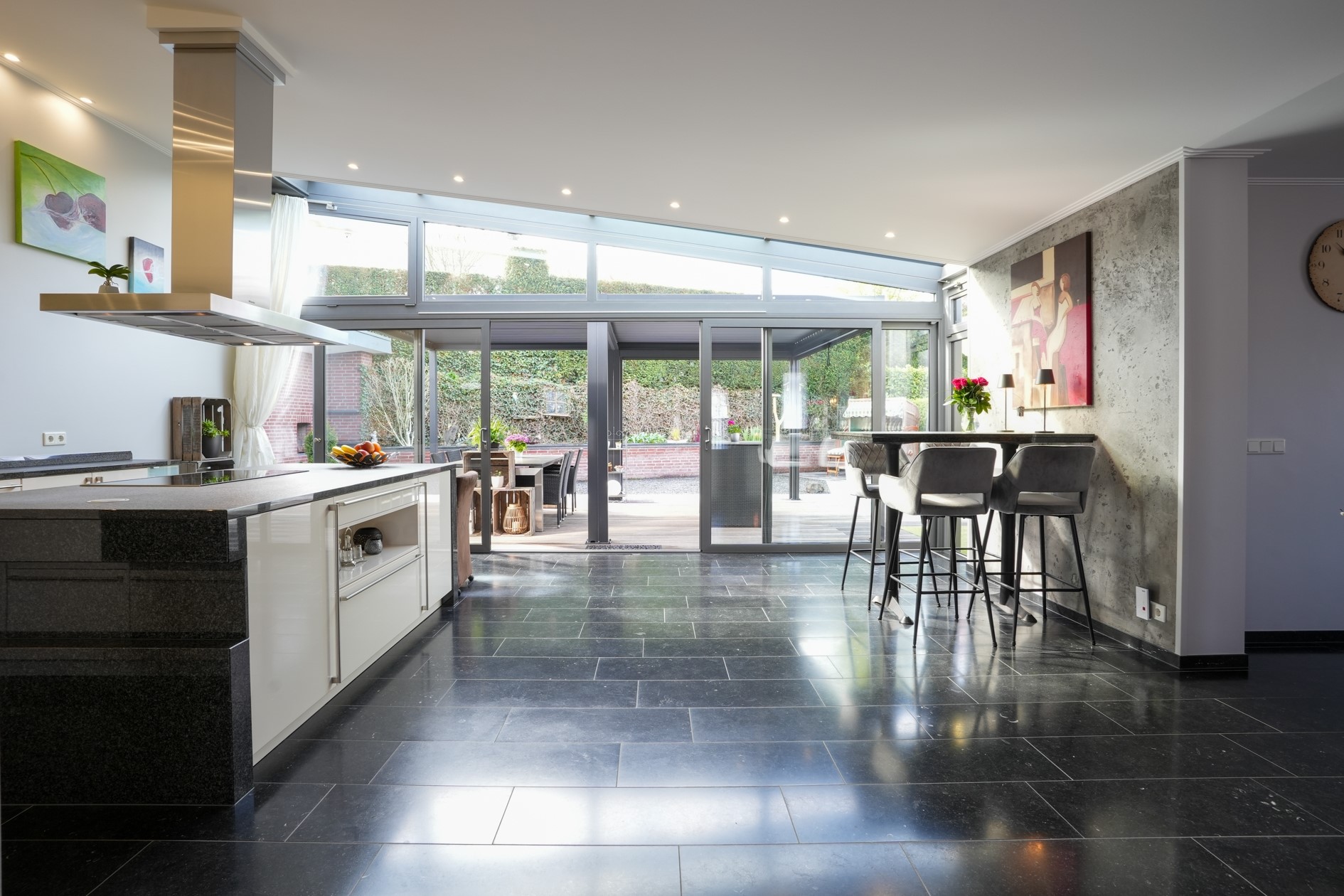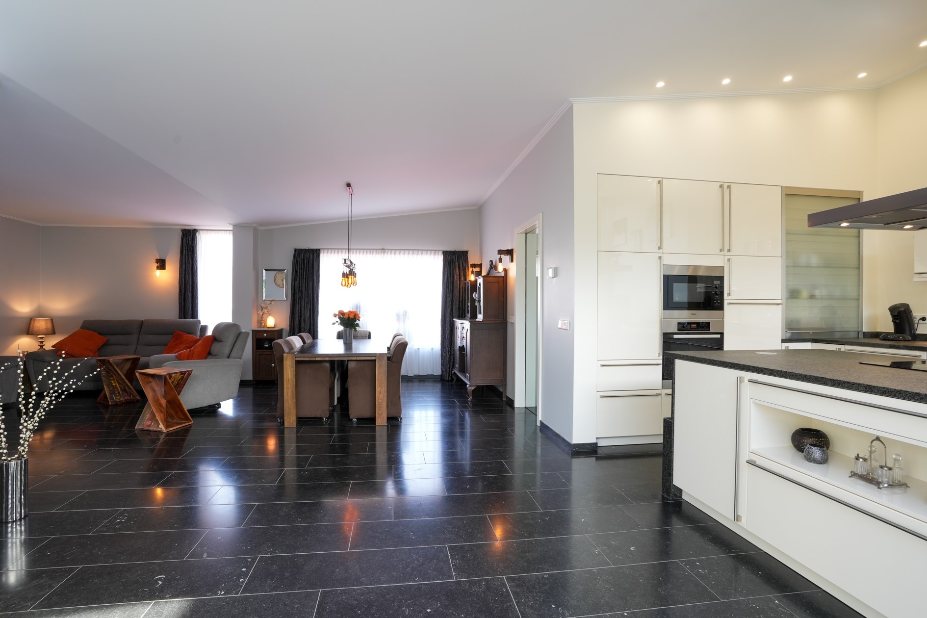 De royale woonkamer met open keuken met een totale oppervlakte van circa 70 m² en heeft dankzij de grote schuifpui een prachtige verbinding met de tuin.