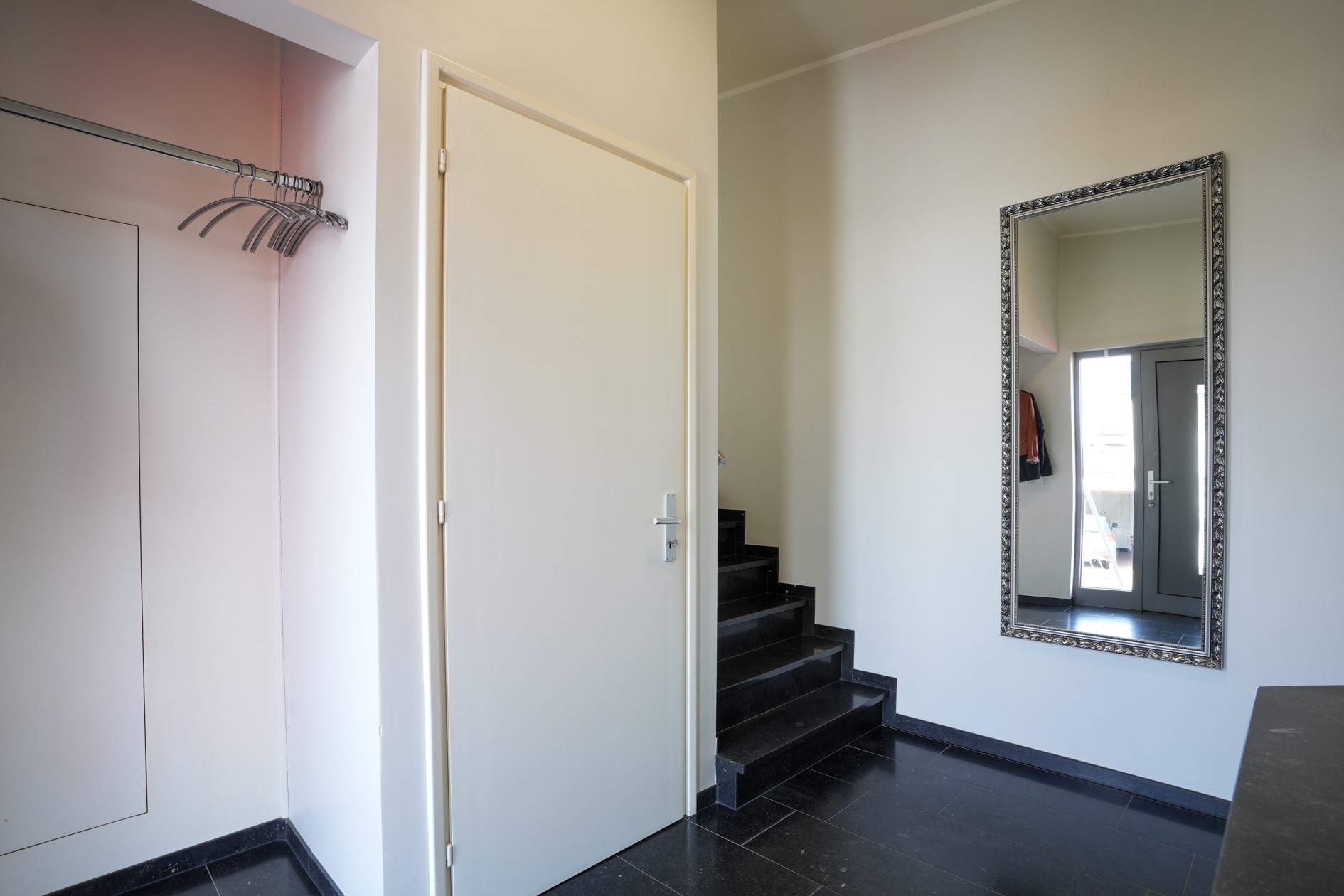 De gehele verdieping is afgewerkt met een stijlvolle natuurstenen vloer van blauwsteen, voorzien van comfortabele vloerverwarming.