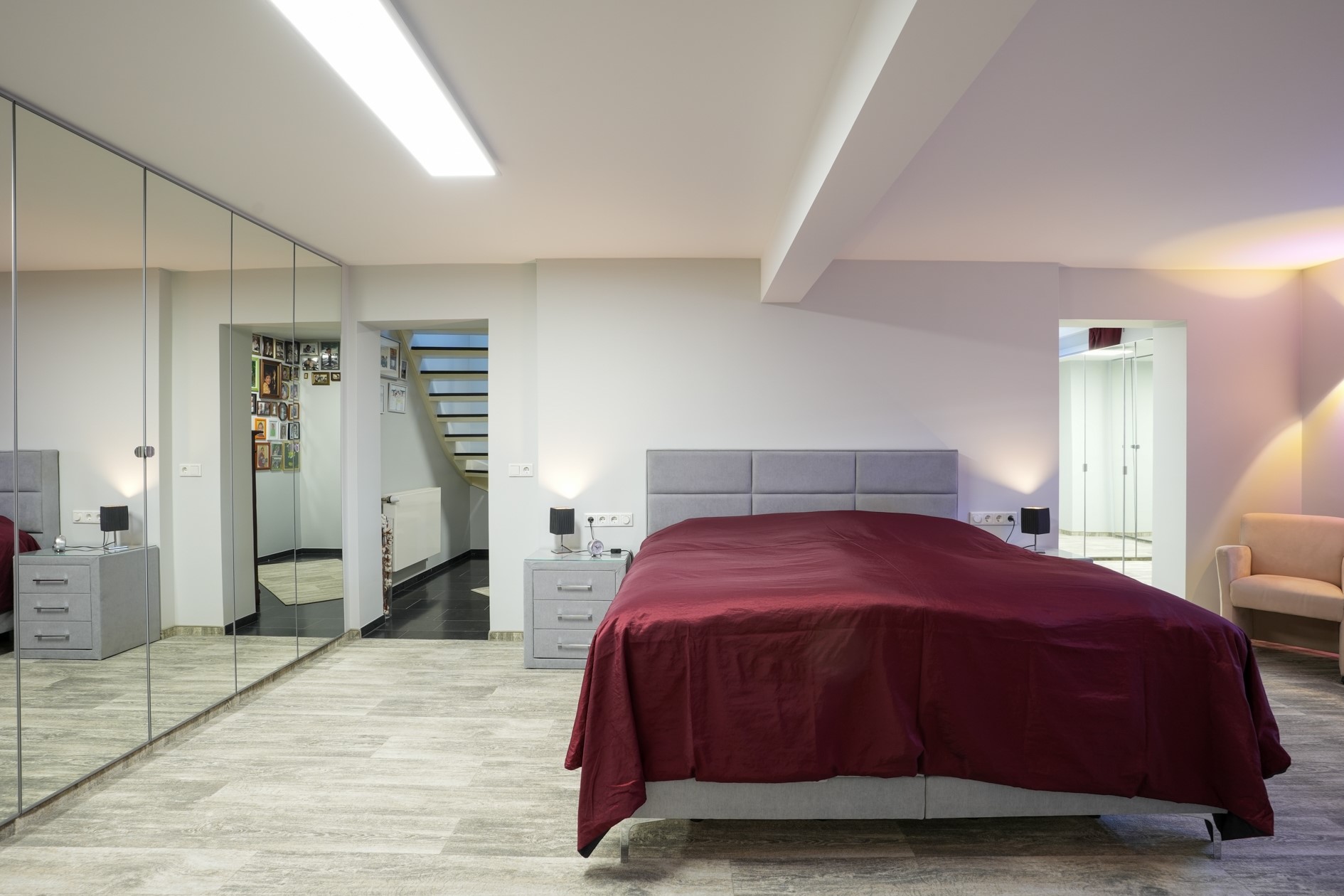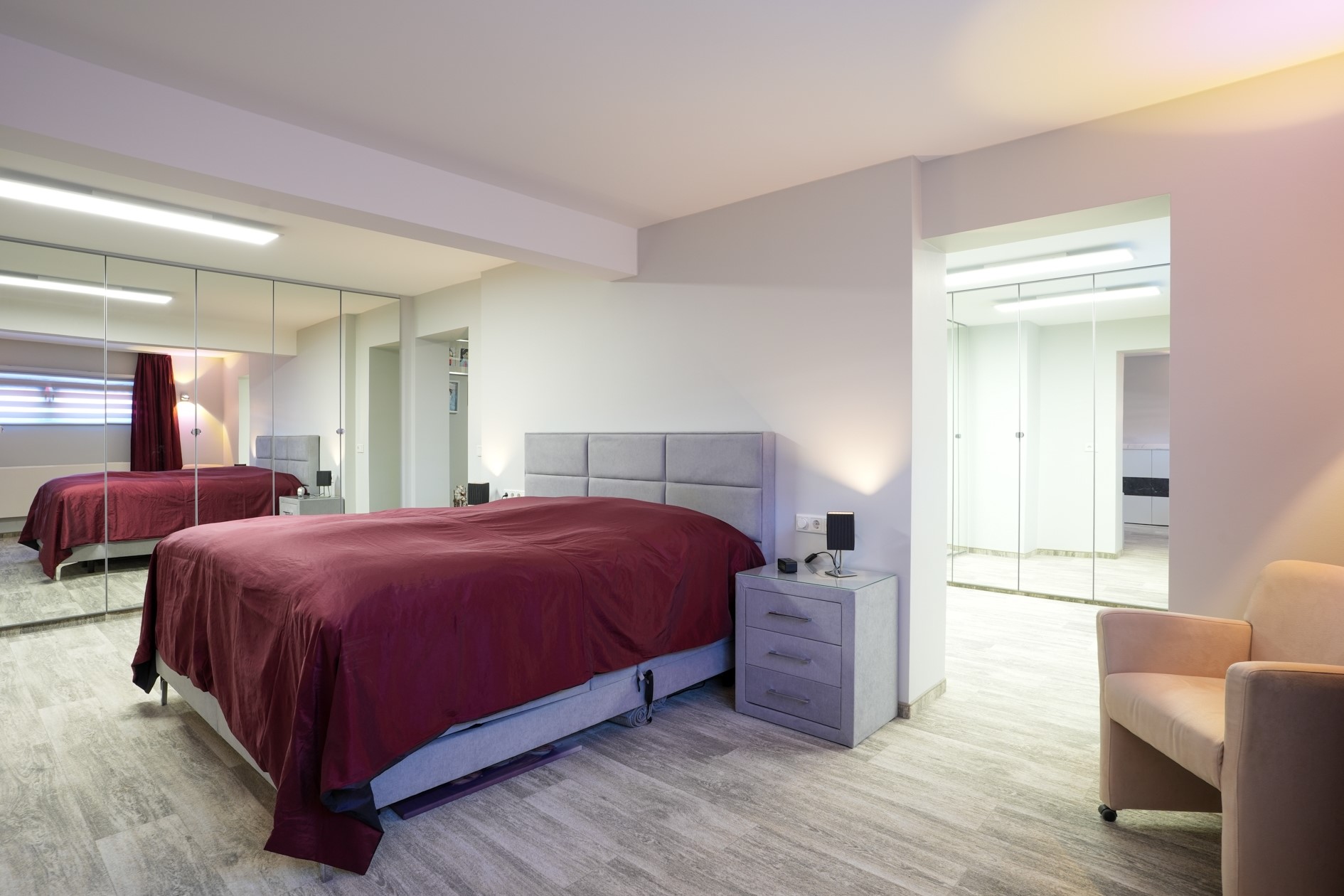 In het souterrain bevindt zich de masterbedroom (26,5 m²), waar rust en comfort centraal staan. De royale slaapkamer is een heerlijke, koele ruimte met daglicht en beschikt over een vaste inbouwkast. Aangrenzend bevindt zich een ruime kleedkamer (10,5 m²) met maatwerkkasten.