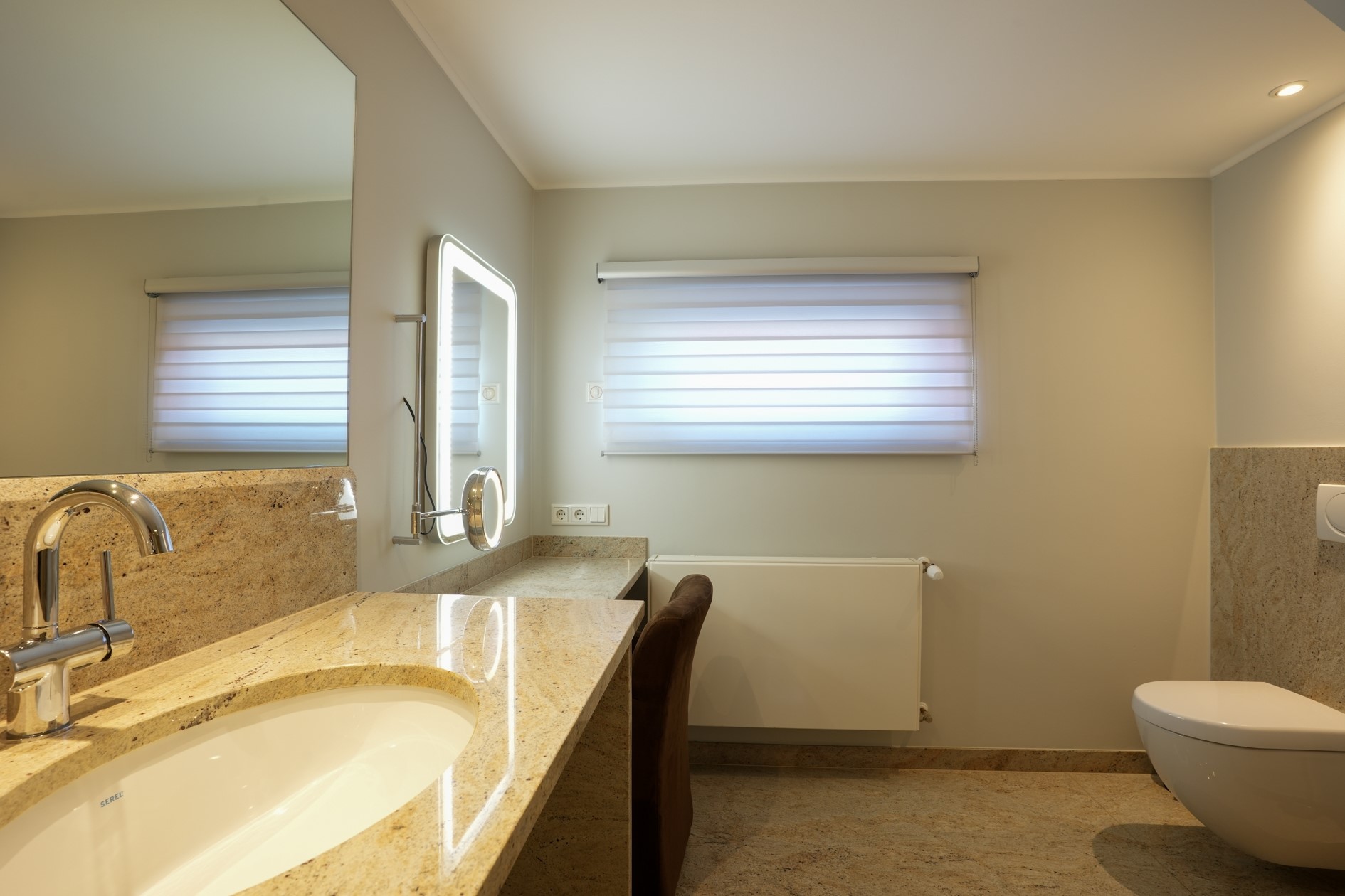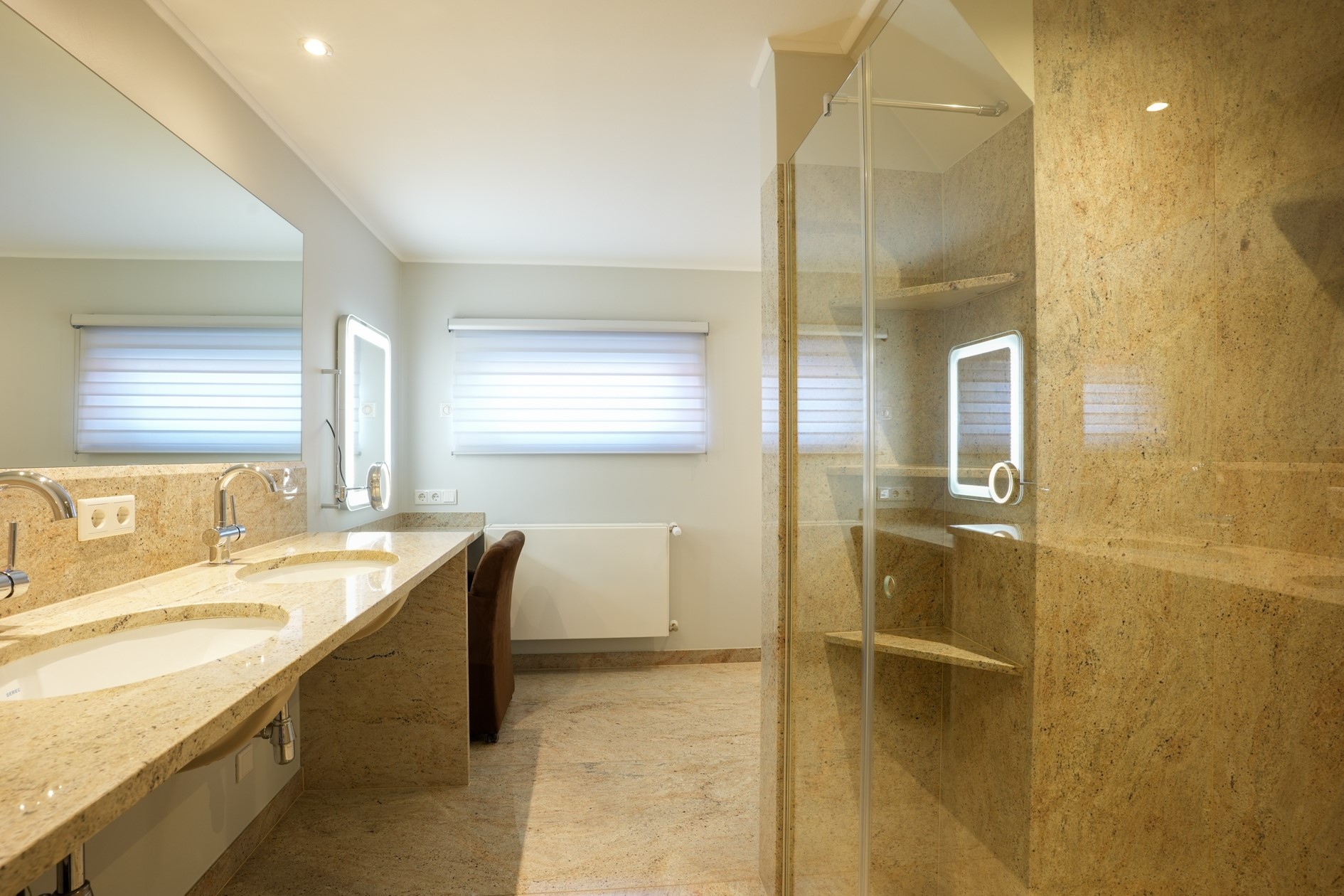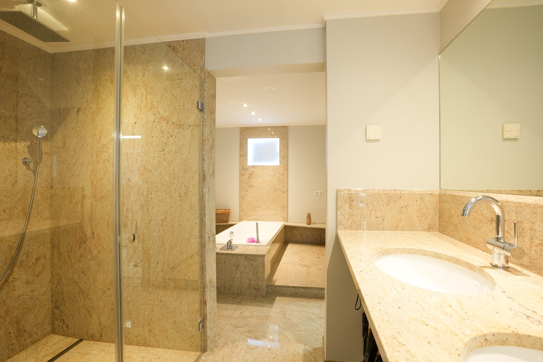De badkamer ensuite (16 m²) is bijzonder luxe uitgevoerd in graniet en voorzien van een ligbad, inloopdouche, dubbele wastafel en zwevend toilet, aangevuld met elektrische vloerverwarming voor extra comfort.