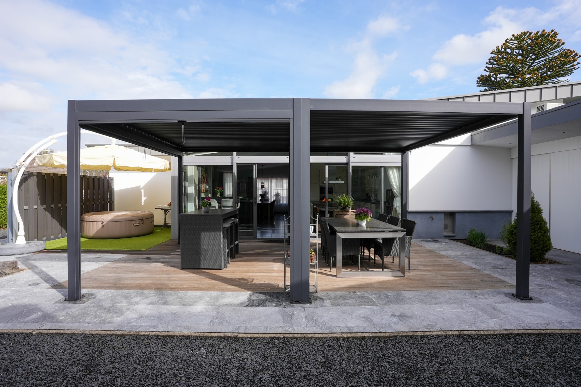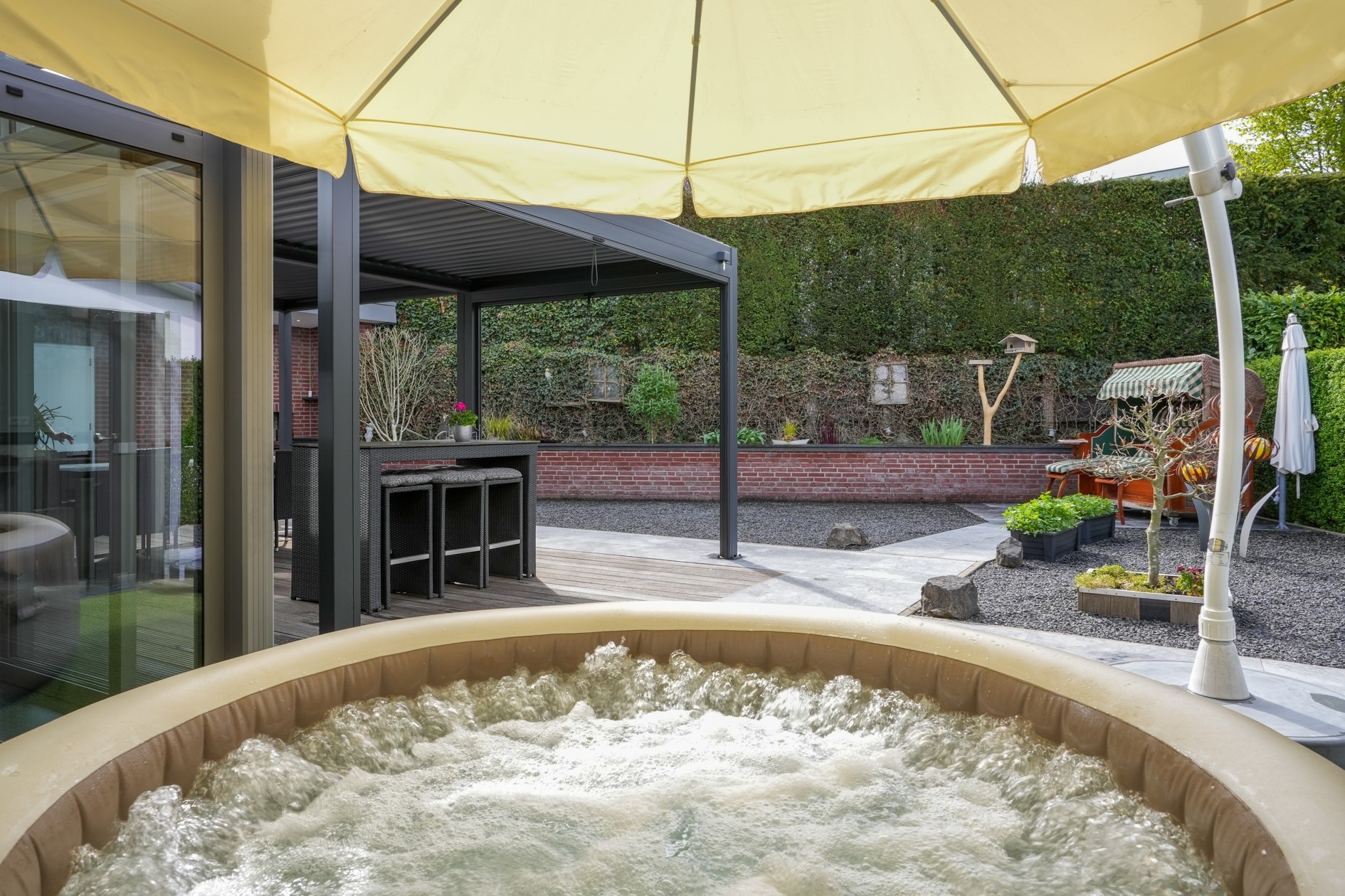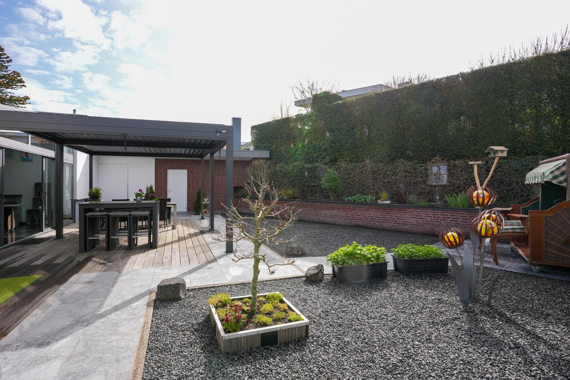 De buitenruimte vormt een verlengstuk van het wooncomfort. De fraai aangelegde tuin ligt op het zuiden en biedt veel privacy. Hier geniet je van een royaal houten terras met een vrijstaande aluminium overkapping, ideaal om lange dagen buiten door te brengen. De tuin is volledig voorzien van sfeerverlichting en ook via een trap naast de woning bereikbaar.