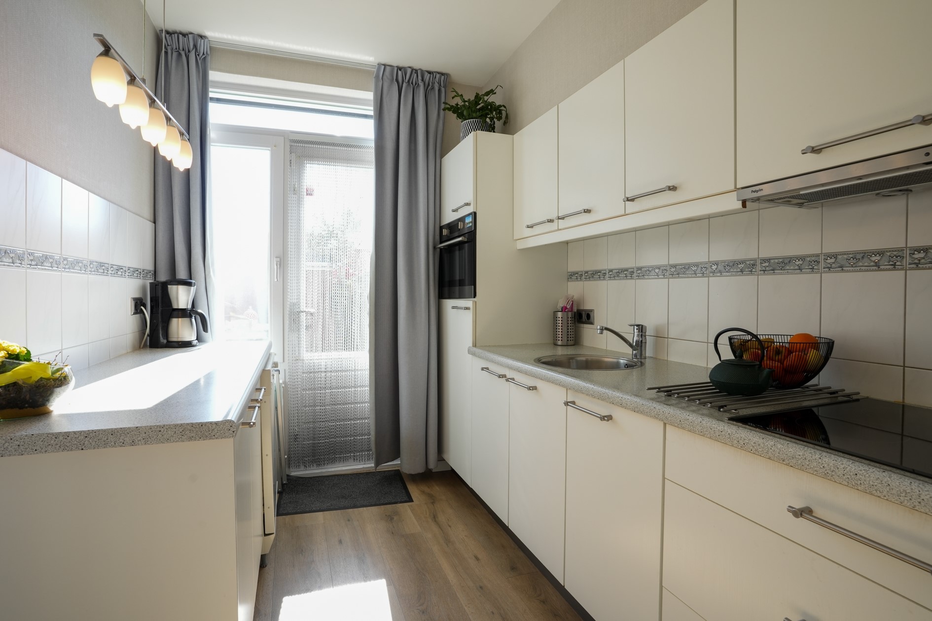 De halfopen keuken (6,6 m²) is uitgerust met een koelkast, combimagnetron, afzuigkap en inductiekookplaat.