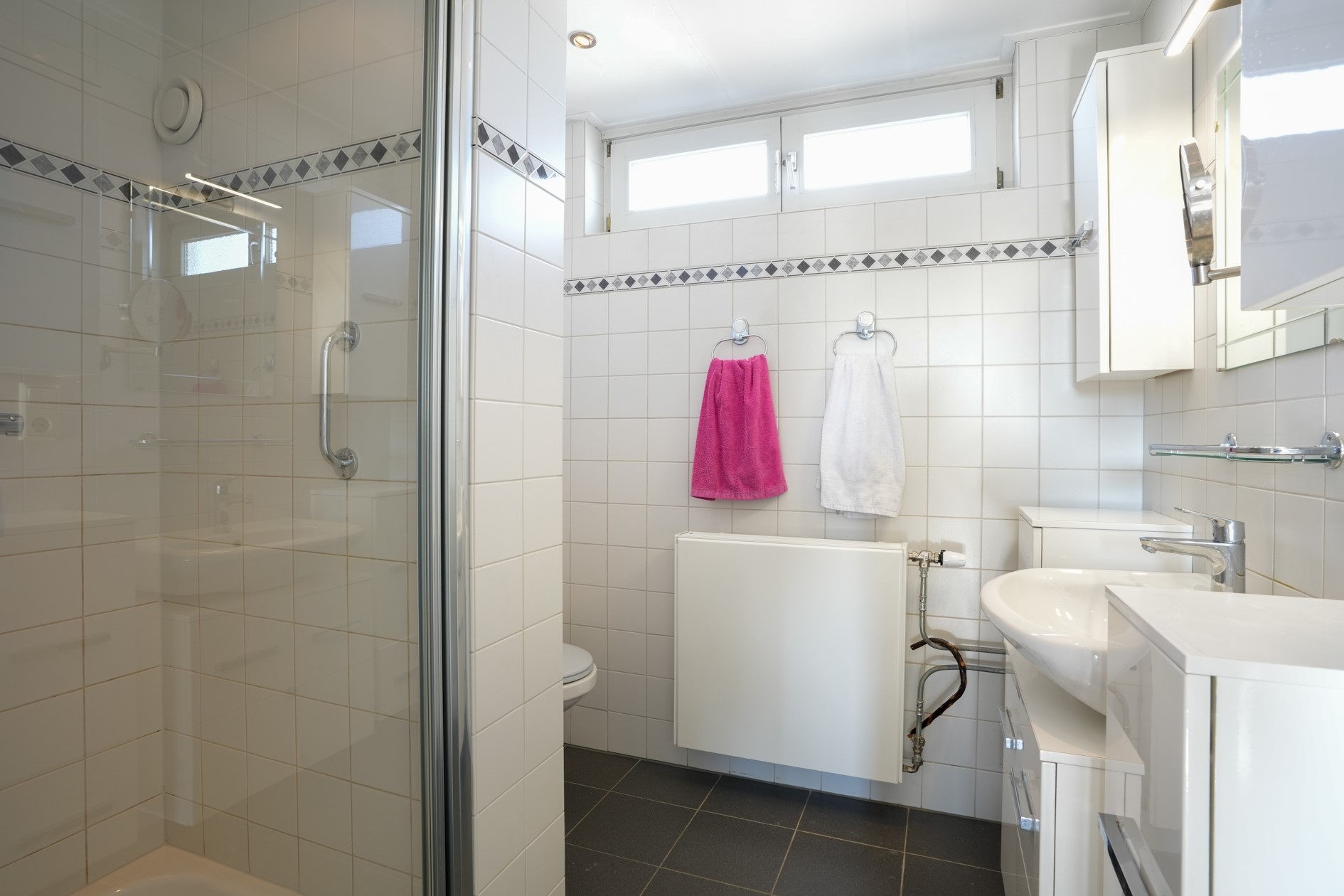 De nette badkamer (4,5 m²) is voorzien van een douche, wastafel en toilet.